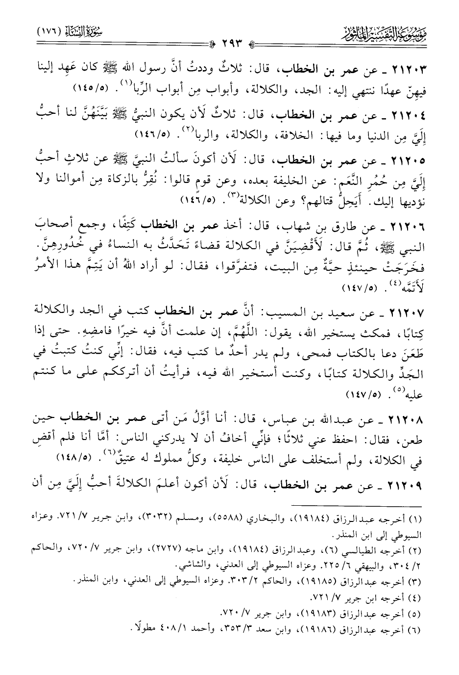 ٢١٢٠٤ - عن عمر بن الخطاب، قال: ثلاثٌ لَأن يكون النبي - صلى الله عليه وسلم - بَيَّنَهُنَّ لنا أحبُّ إلَيَّ مِن الدنيا وما فيها: الخلافة، والكلالة، والربا (¬٢). (٥/ ١٤٦)