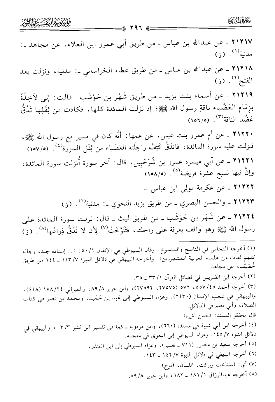 ٢١٢٢٤ - عن شَهْر بن حَوْشَب -من طريق ليث- قال: نزلت سورة المائدة على رسول الله - صلى الله عليه وسلم - وهو واقف بعرفة على راحلته، فتَنَوَّخَتْ (¬٧) لِأن لا تُدَقَّ ذِراعُها (¬٨). (ز)