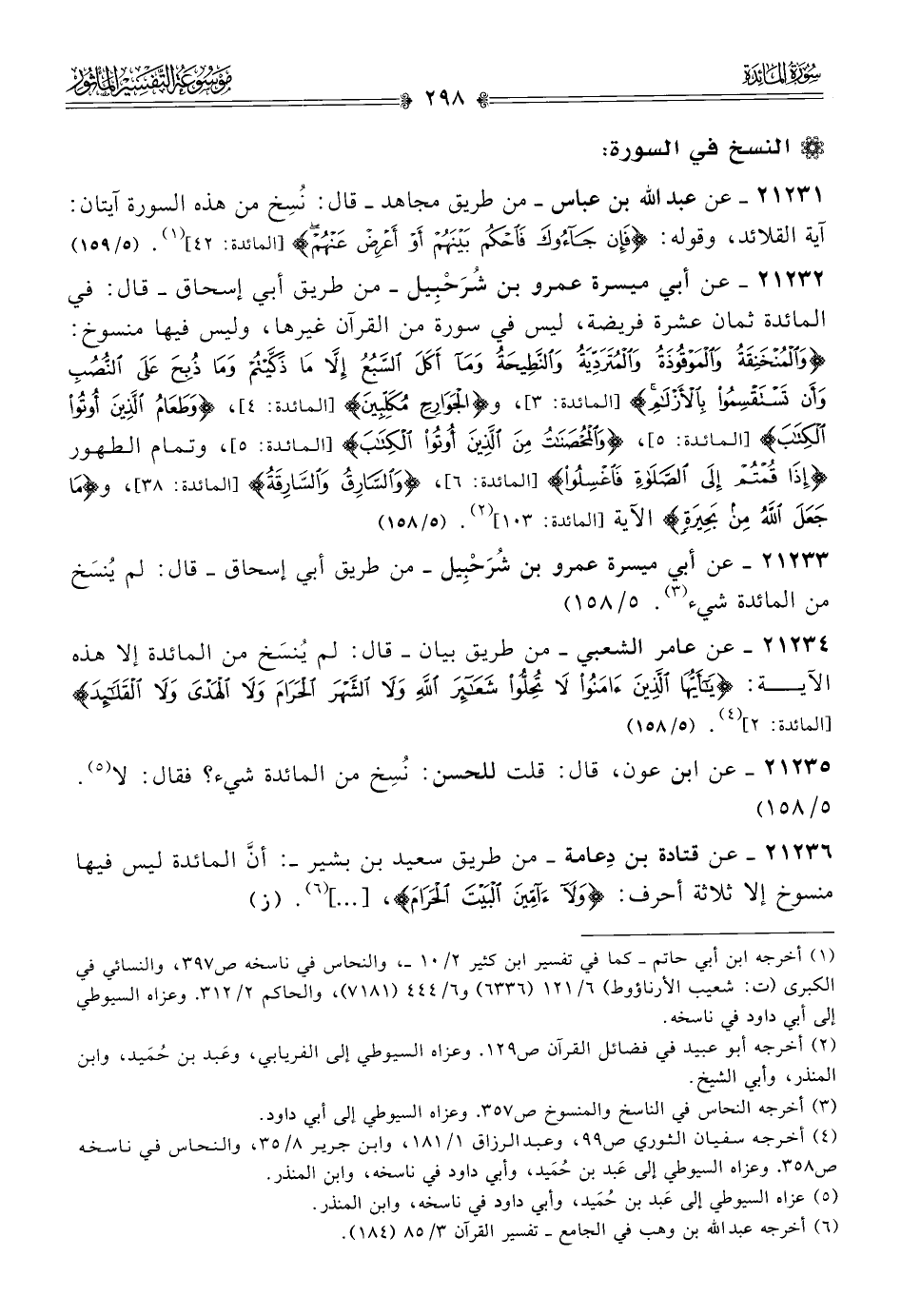 ٢١٢٣٤ - عن عامر الشعبي -من طريق بيان- قال: لم يُنسَخ من المائدة إلا هذه الآية: {يا أيها الذين آمنوا لا تحلوا شعائر الله ولا الشهر الحرام ولا الهدي ولا القلائد} [المائدة: ٢] (¬٤). (٥/ ١٥٨)