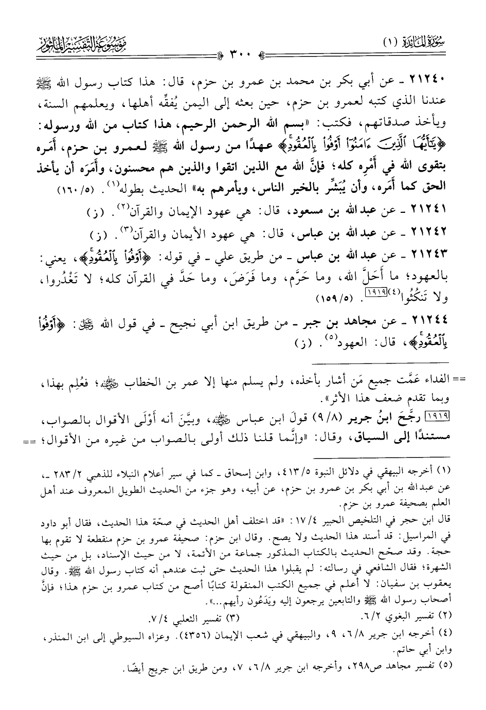 ٢١٢٤٣ - عن عبد الله بن عباس -من طريق علي- في قوله: {أوفوا بالعقود}، يعني: بالعهود؛ ما أحَلَّ الله، وما حَرَّم، وما فَرَضَ، وما حَدَّ في القرآن كله؛ لا تَغْدُروا، ولا تَنكُثُوا [١٩١٩] (¬٤). (٥/ ١٥٩)