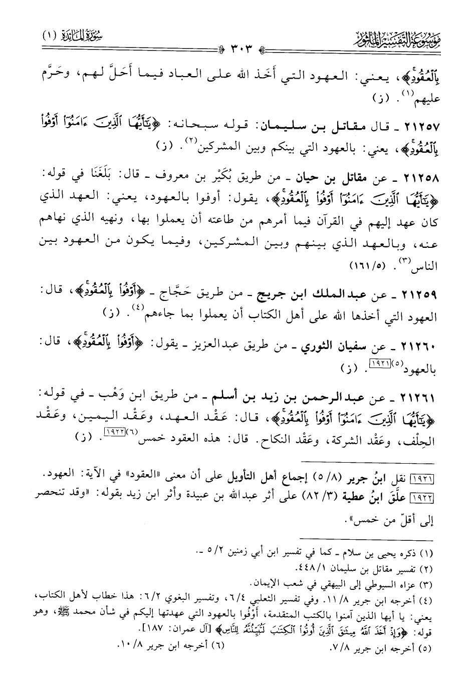 ٢١٢٦٠ - عن سفيان الثوري -من طريق عبد العزيز- يقول: {أوفوا بالعقود}، قال: بالعهود (¬٥) [١٩٢١]. (ز)
