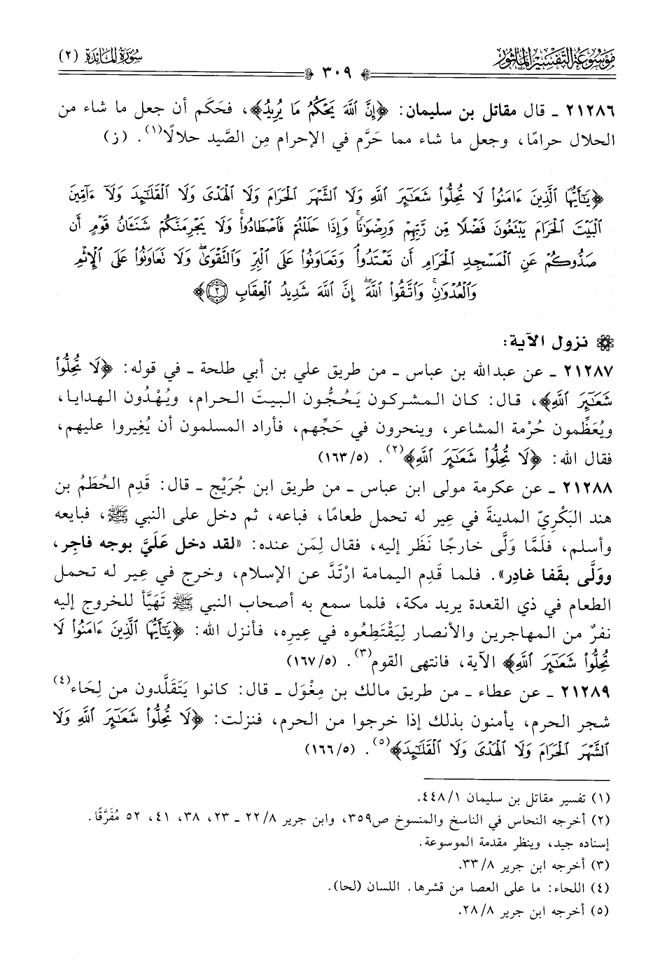 ٢١٢٨٧ - عن عبد الله بن عباس -من طريق علي بن أبي طلحة- في قوله: {لا تحلوا شعائر الله}، قال: كان المشركون يَحُجُّون البيتَ الحرام، ويُهْدُون الهدايا، ويُعَظِّمون حُرْمة المشاعر، وينحرون في حَجِّهم، فأراد المسلمون أن يُغِيروا عليهم، فقال الله: {لا تحلوا شعائر الله} (¬٢). (٥/ ١٦٣)