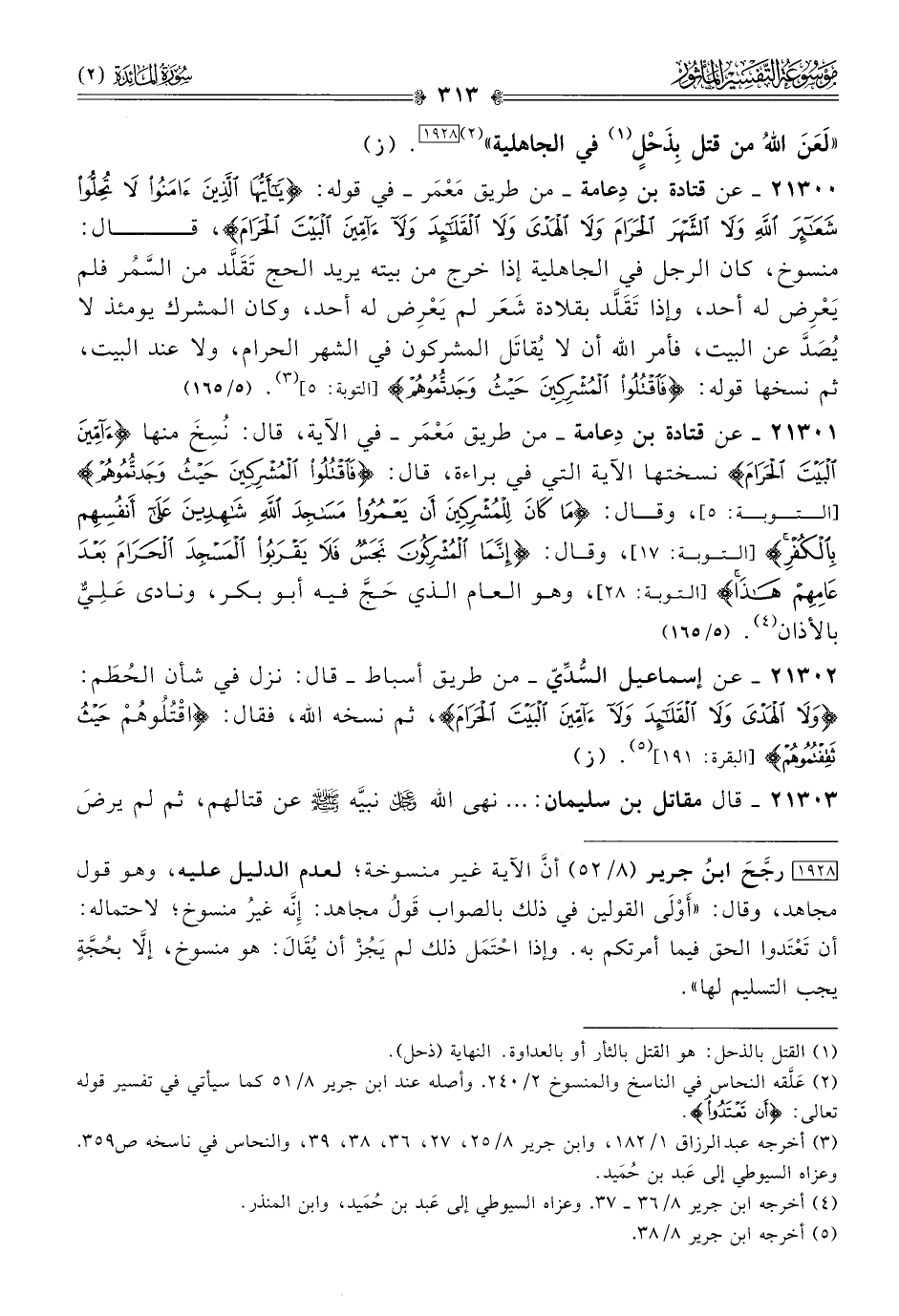 ٢١٣٠٠ - عن قتادة بن دِعامة -من طريق مَعْمَر- في قوله: {يا أيها الذين آمنوا لا تحلوا شعائر الله ولا الشهر الحرام ولا الهدي ولا القلائد ولا آمين البيت الحرام}، قال: منسوخ، كان الرجل في الجاهلية إذا خرج من بيته يريد الحج تَقَلَّد من السَّمُر فلم يَعْرِض له أحد، وإذا تَقَلَّد بقلادة شَعَر لم يَعْرِض له أحد، وكان المشرك يومئذ لا يُصَدَّ عن البيت، فأمر الله أن لا يُقاتَل المشركون في الشهر الحرام، ولا عند البيت، ثم نسخها قوله: {فاقتلوا المشركين حيث وجدتموهم} [التوبة: ٥] (¬٣).