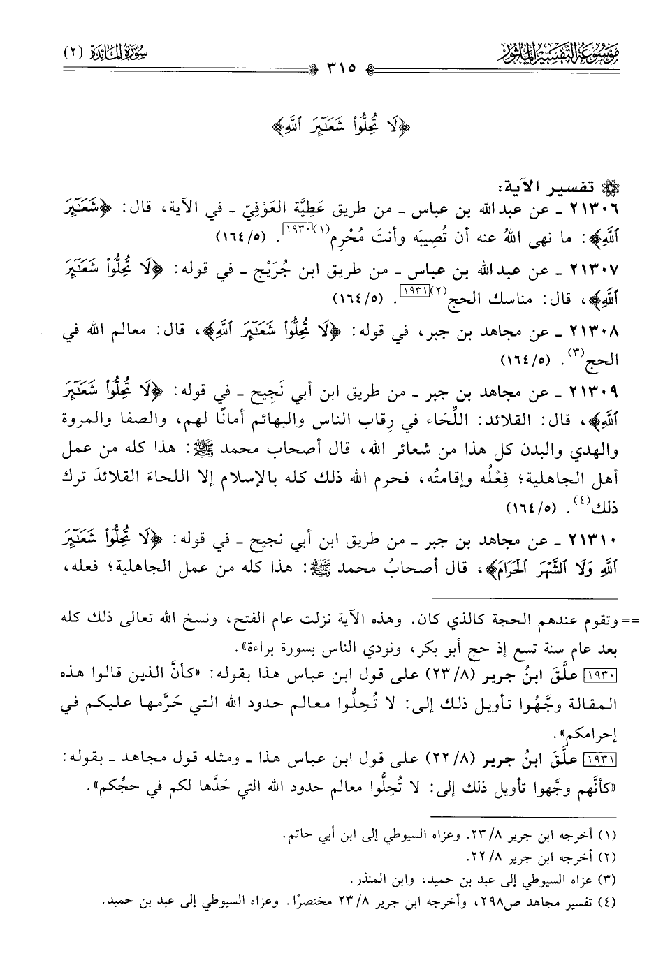 [١٩٣٠] علَّقَ ابنُ جرير (٨/ ٢٣) على قول ابن عباس هذا بقوله: «كأنّ الذين قالوا هذه المقالة وجَّهُوا تأويل ذلك إلى: لا تُحِلُّوا معالم حدود الله التي حَرَّمها عليكم في إحرامكم».