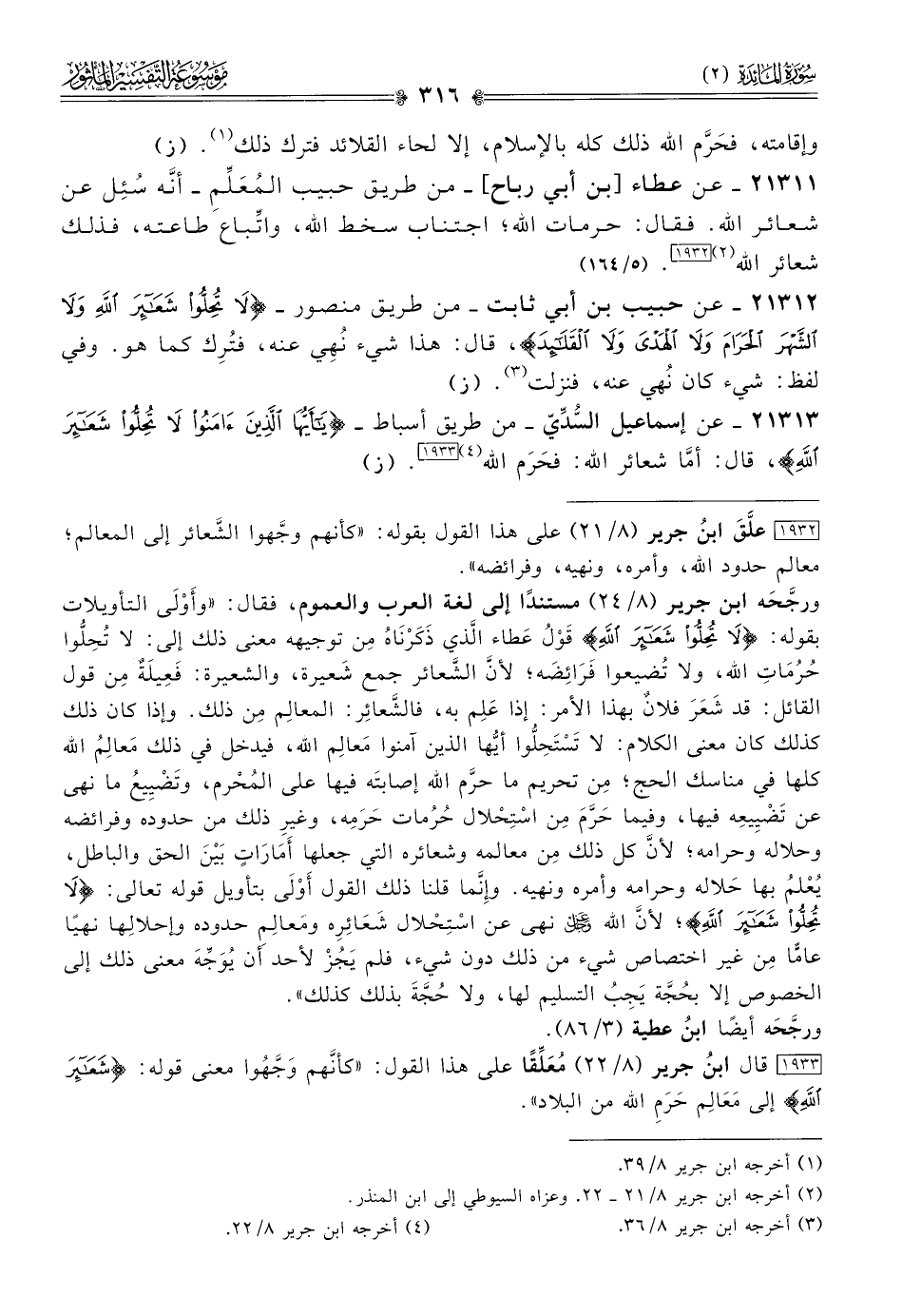 [١٩٣٢] علَّقَ ابنُ جرير (٨/ ٢١) على هذا القول بقوله: «كأنهم وجَّهوا الشَّعائر إلى المعالم؛ معالم حدود الله، وأمره، ونهيه، وفرائضه».