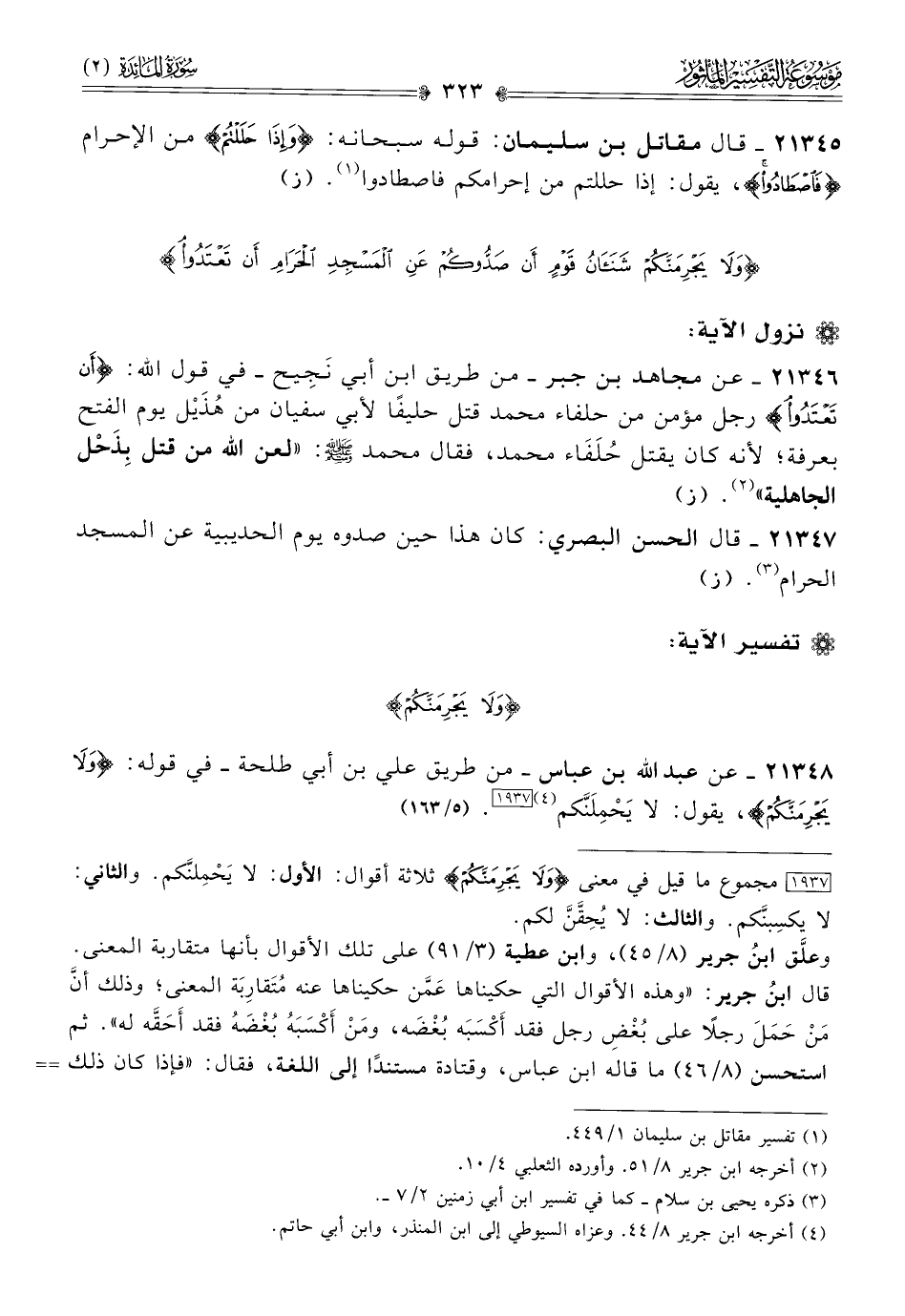٢١٣٤٦ - عن مجاهد بن جبر -من طريق ابن أبي نَجِيح- في قول الله: {أن تعتدوا} رجل مؤمن من حلفاء محمد قتل حليفًا لأبي سفيان من هُذَيْل يوم الفتح بعرفة؛ لأنه كان يقتل حُلَفاء محمد، فقال محمد - صلى الله عليه وسلم -: «لعن الله من قتل بِذَحْل الجاهلية» (¬٢). (ز)