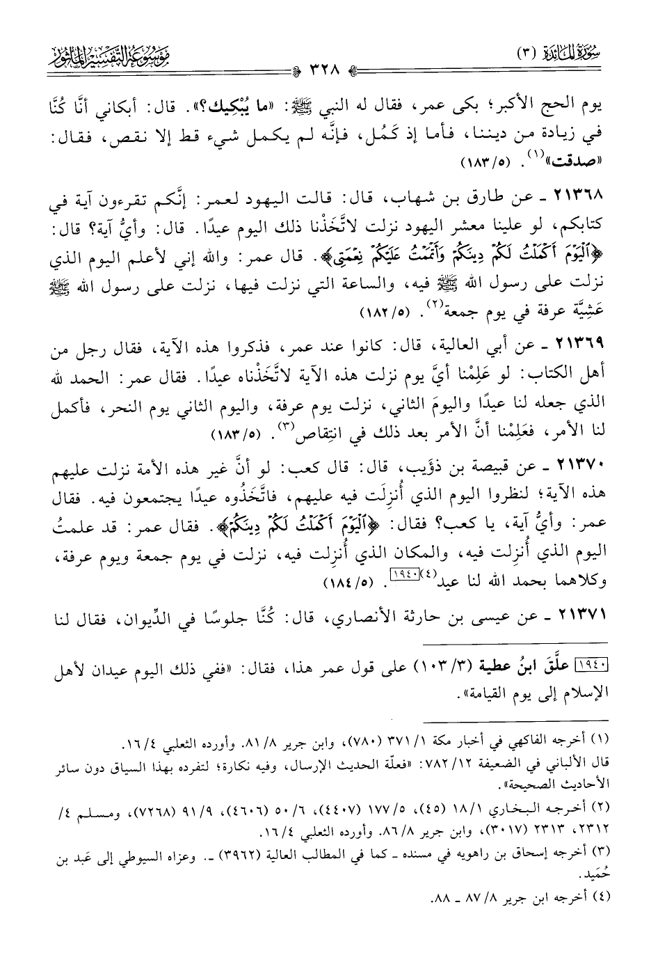 ٢١٣٦٩ - عن أبي العالية، قال: كانوا عند عمر، فذكروا هذه الآية، فقال رجل من أهل الكتاب: لو عَلِمْنا أيَّ يوم نزلت هذه الآية لاتَّخَذْناه عيدًا. فقال عمر: الحمد لله الذي جعله لنا عيدًا واليومَ الثاني، نزلت يوم عرفة، واليوم الثاني يوم النحر، فأكمل لنا الأمر، فعَلِمْنا أنّ الأمر بعد ذلك في انتِقاص (¬٣). (٥/ ١٨٣)