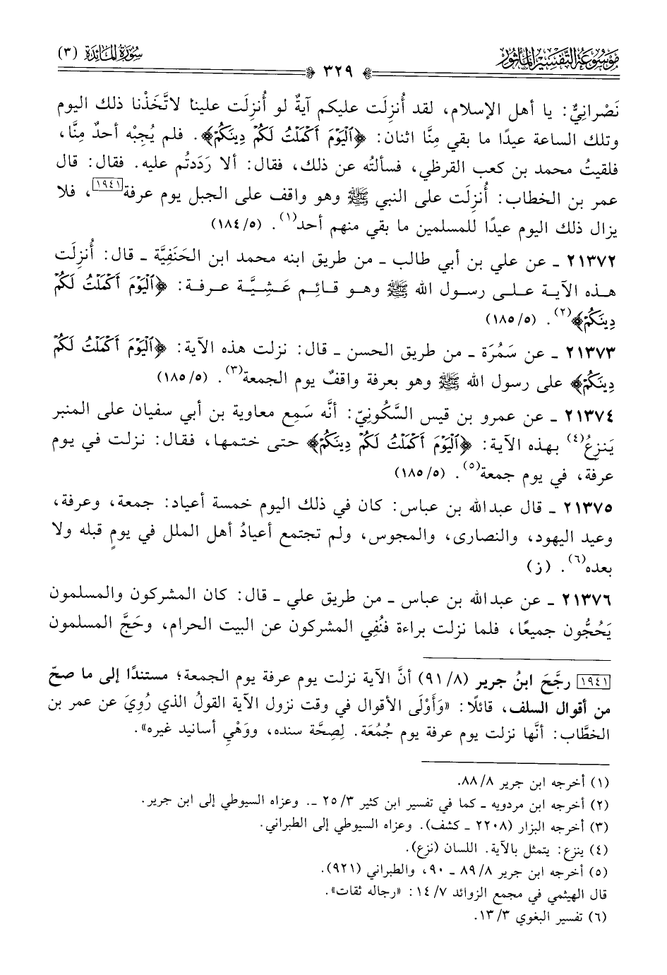 ٢١٣٧٢ - عن علي بن أبي طالب -من طريق ابنه محمد ابن الحَنَفِيَّة- قال: أُنزِلَت هذه الآية على رسول الله - صلى الله عليه وسلم - وهو قائِم عَشِيَّة عرفة: {اليوم أكملت لكم دينكم} (¬٢). (٥/ ١٨٥)