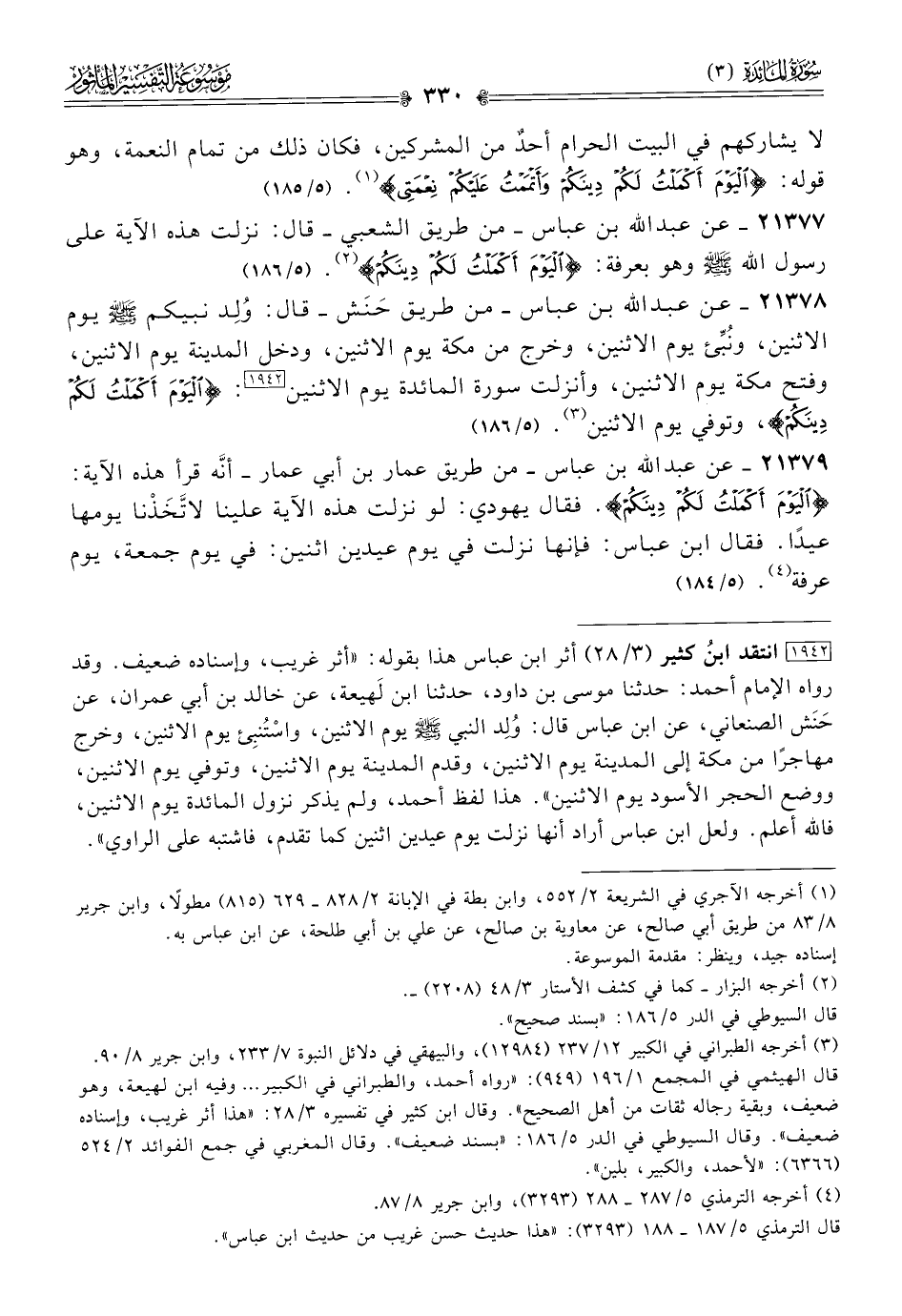 [١٩٤٢] انتقد ابنُ كثير (٣/ ٢٨) أثر ابن عباس هذا بقوله: «أثر غريب، وإسناده ضعيف. وقد رواه الإمام أحمد: حدثنا موسى بن داود، حدثنا ابن لَهيعة، عن خالد بن أبي عمران، عن حَنَش الصنعاني، عن ابن عباس قال: وُلِد النبي - صلى الله عليه وسلم - يوم الاثنين، واسْتُنبِئ يوم الاثنين، وخرج مهاجرًا من مكة إلى المدينة يوم الاثنين، وقدم المدينة يوم الاثنين، وتوفي يوم الاثنين، ووضع الحجر الأسود يوم الاثنين.» هذا لفظ أحمد، ولم يذكر نزول المائدة يوم الاثنين، فالله أعلم. ولعل ابن عباس أراد أنها نزلت يوم عيدين اثنين كما تقدم، فاشتبه على الراوي".