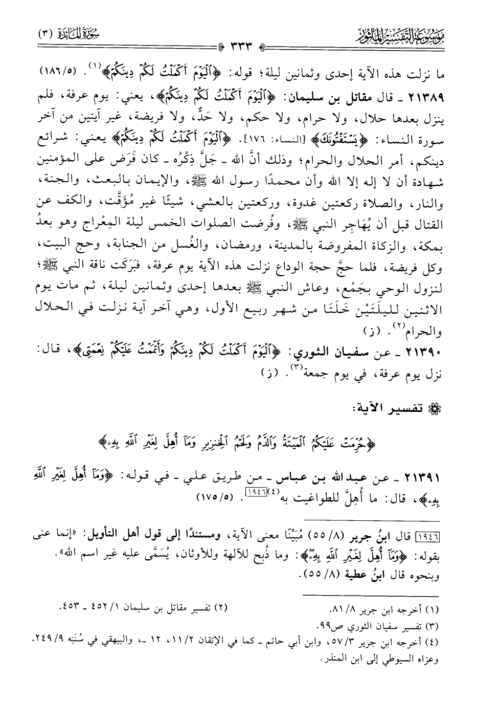٢١٣٩٠ - عن سفيان الثوري: {اليَوْمَ أكْمَلْتُ لَكُمْ دِينَكُمْ وأَتْمَمْتُ عَلَيْكُمْ نِعْمَتِي}، قال: نزل يوم عرفة، في يوم جمعة (¬٣). (ز)