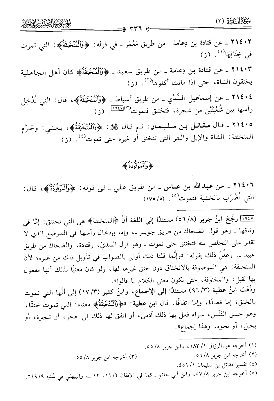 [١٩٤٧] رجَّحَ ابنُ جرير (٨/ ٥٦) مستندًا إلى اللغة أنّ {المنخنقة} هي التي تختنق: إمّا في وثاقها -وهو قول الضحاك من طريق جويبر-، وإما بإدخال رأسها في الموضع الذي لا تقدر على التخلص منه فتختنق حتى تموت -وهو قول السديّ، وقتادة، والضحاك من طريق عبيد-. وعلَّلَ ذلك بقوله: «وإنّما قلنا ذلك أولى بالصواب في تأويل ذلك من غيره؛ لأن المنخنقة: هي الموصوفة بالانخناق دون خنق غيرها لها، ولو كان معنيًّا بذلك أنها مفعول بها لقيل: والمخنوقة، حتى يكون معنى الكلام ما قالوا».