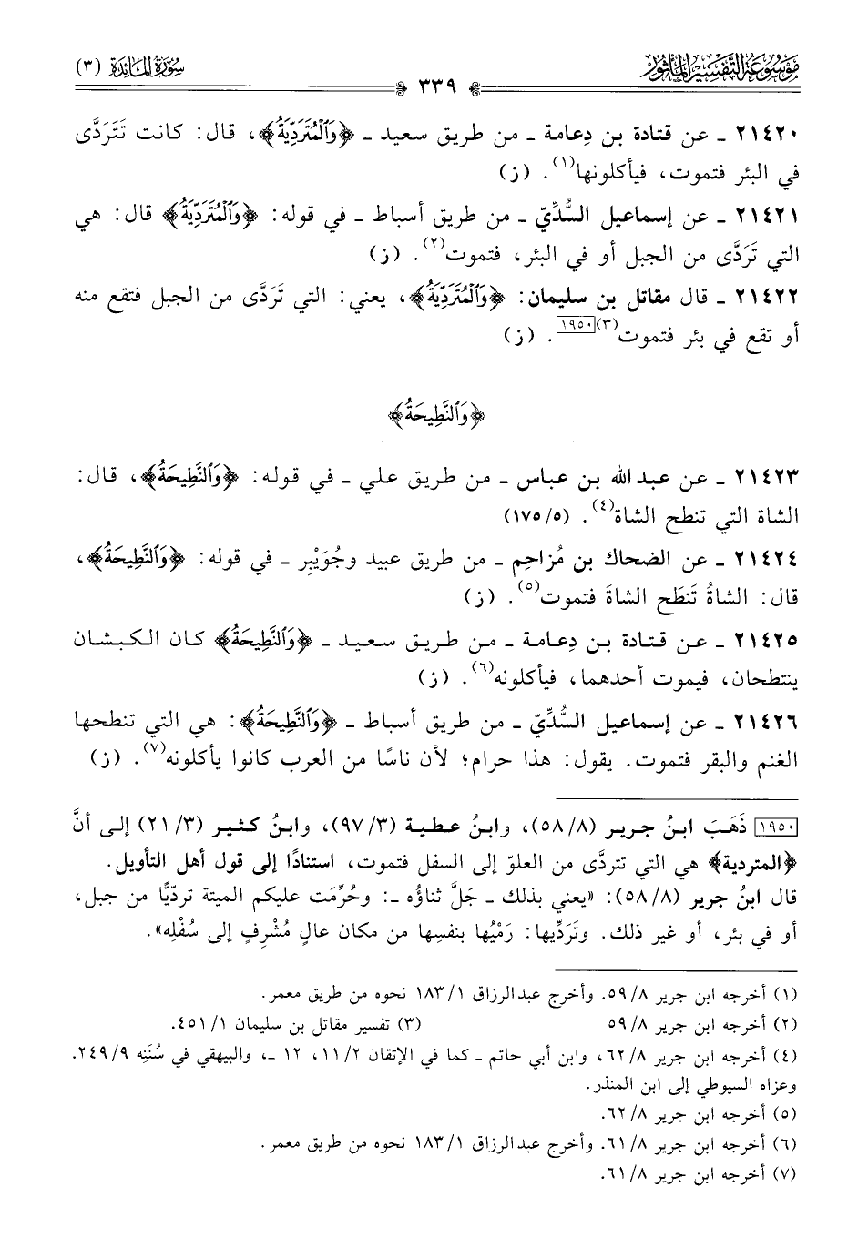 ٢١٤٢٠ - عن قتادة بن دِعامة -من طريق سعيد- {والمتردية}، قال: كانت تَتَرَدّى في البئر فتموت، فيأكلونها (¬١). (ز)