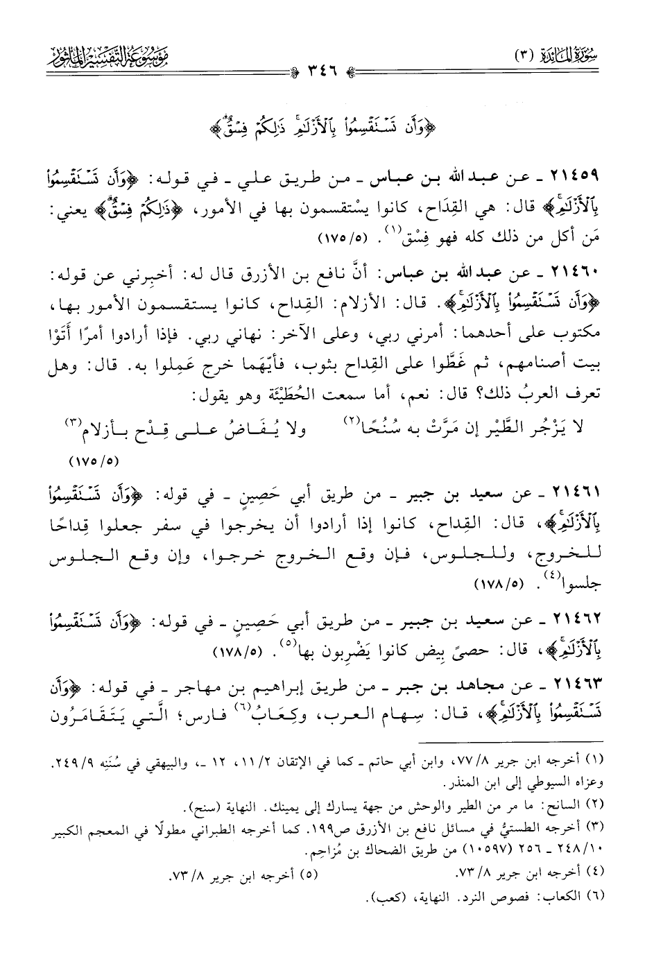 ٢١٤٦٣ - عن مجاهد بن جبر -من طريق إبراهيم بن مهاجر- في قوله: {وأن تستقسموا بالأزلام}، قال: سِهام العرب، وكِعابُ (¬٦) فارس؛ الَّتي يَتَقامَرُون