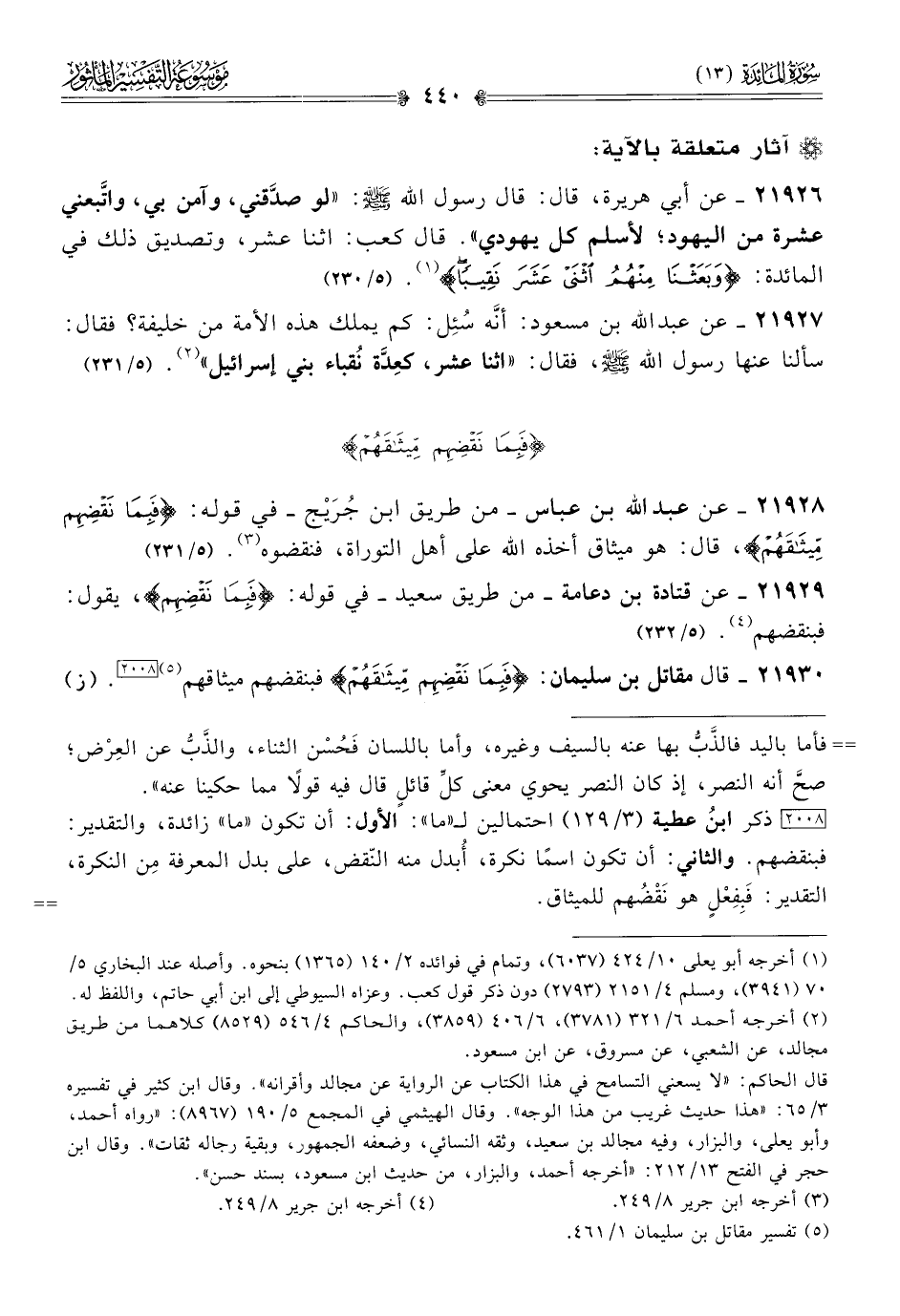 ٢١٩٢٦ - عن أبي هريرة، قال: قال رسول الله - صلى الله عليه وسلم -: «لو صدَّقني، وآمن بي، واتَّبعني عشرة من اليهود؛ لأسلم كل يهودي». قال كعب: اثنا عشر، وتصديق ذلك في المائدة: {وبعثنا منهم اثني عشر نقيبا} (¬١). (٥/ ٢٣٠)