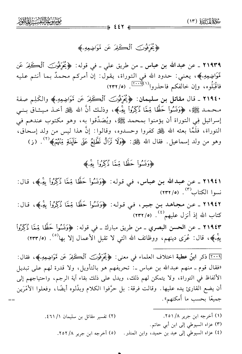 ٢١٩٣٩ - عن عبد الله بن عباس -من طريق علي- في قوله: {يحرفون الكلم عن مواضعه}، يعني: حدود الله في التوراة، يقول: إن أمركم محمدٌ بما أنتم عليه فاقْبَلُوه، وإن خالفكم فاحذروا (¬١) [٢٠٠٩]. (٥/ ٢٣٢)