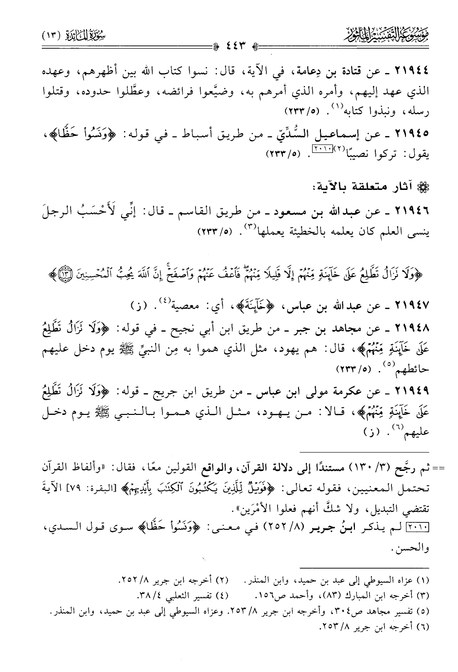 ٢١٩٤٩ - عن عكرمة مولى ابن عباس -من طريق ابن جريج- قوله: {ولا تزال تطلع على خائنة منهم}، قالا: من يهود، مثل الذي هموا بالنبي - صلى الله عليه وسلم - يوم دخل عليهم (¬٦). (ز)