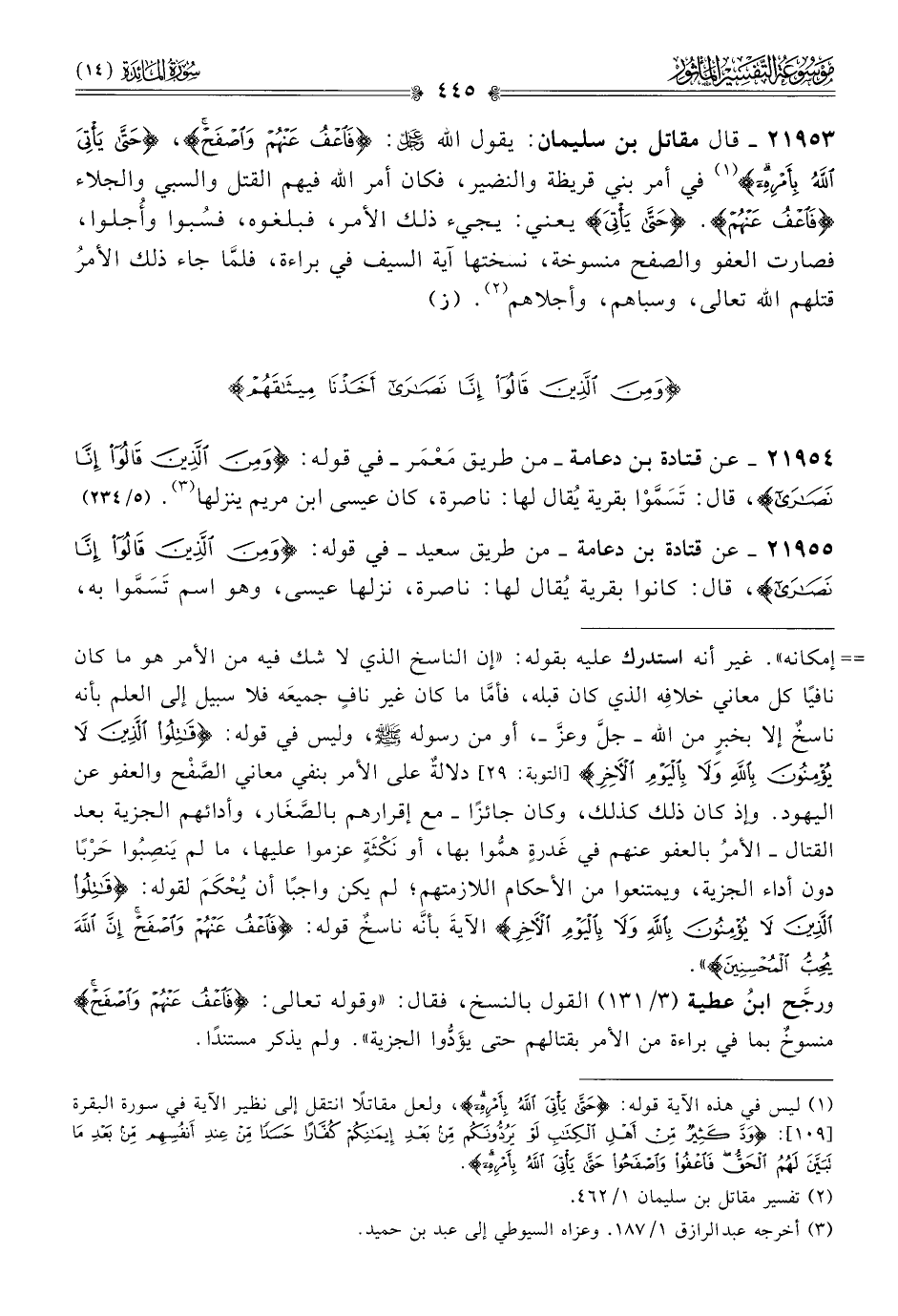 ٢١٩٥٣ - قال مقاتل بن سليمان: يقول الله - عز وجل -: {فاعْفُ عَنْهُمْ واصْفَحْ}، {حتى يأتي الله بأمره} (¬١) في أمر بني قريظة والنضير، فكان أمر الله فيهم القتل والسبي والجلاء {فاعْفُ عَنْهُمْ}. {حتى يأتي} يعني: يجيء ذلك الأمر، فبلغوه، فسُبوا وأُجلوا، فصارت العفو والصفح منسوخة، نسختها آية السيف في براءة، فلمّا جاء ذلك الأمرُ قتلهم الله تعالى، وسباهم، وأجلاهم (¬٢). (ز)