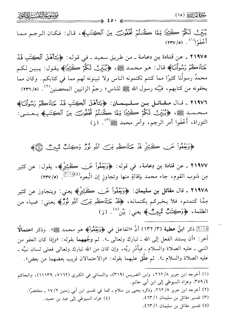 ٢١٩٧٥ - عن قتادة بن دعامة -من طريق سعيد- في قوله: {يا أهل الكتاب قد جاءكم رسولنا} قال: هو محمد - صلى الله عليه وسلم -، {يبين لكم كثيرا} يقول: يبين لكم محمدٌ رسولنا كثيرًا مما كنتم تكتمونه الناس ولا تبينونه لهم مما في كتابكم. وكان مما يخفونه من كتابهم، فبَيَّنه رسول الله - صلى الله عليه وسلم - للناس؛ رجمُ الزانيين المحصنين (¬٢). (٥/ ٢٣٦)