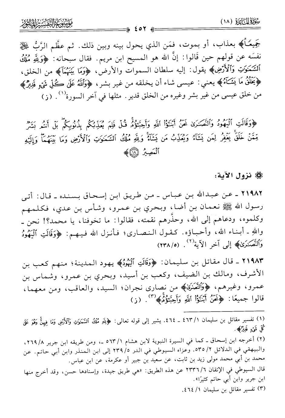 ٢١٩٨٢ - عن عبد الله بن عباس -من طريق ابن إسحاق بسنده- قال: أتى رسول الله - صلى الله عليه وسلم - نعمان بن أضا، وبحري بن عمرو، وشأس بن عدي، فكلمهم وكلموه، ودعاهم إلى الله، وحذَّرهم نقمته، فقالوا: ما تخوفنا، يا محمد؟! نحن -واللهِ- أبناء الله، وأحباؤه. كقول النصارى؛ فأنزل الله فيهم: {وقالت اليهود والنصارى} إلى آخر الآية (¬٢). (٥/ ٢٣٨)