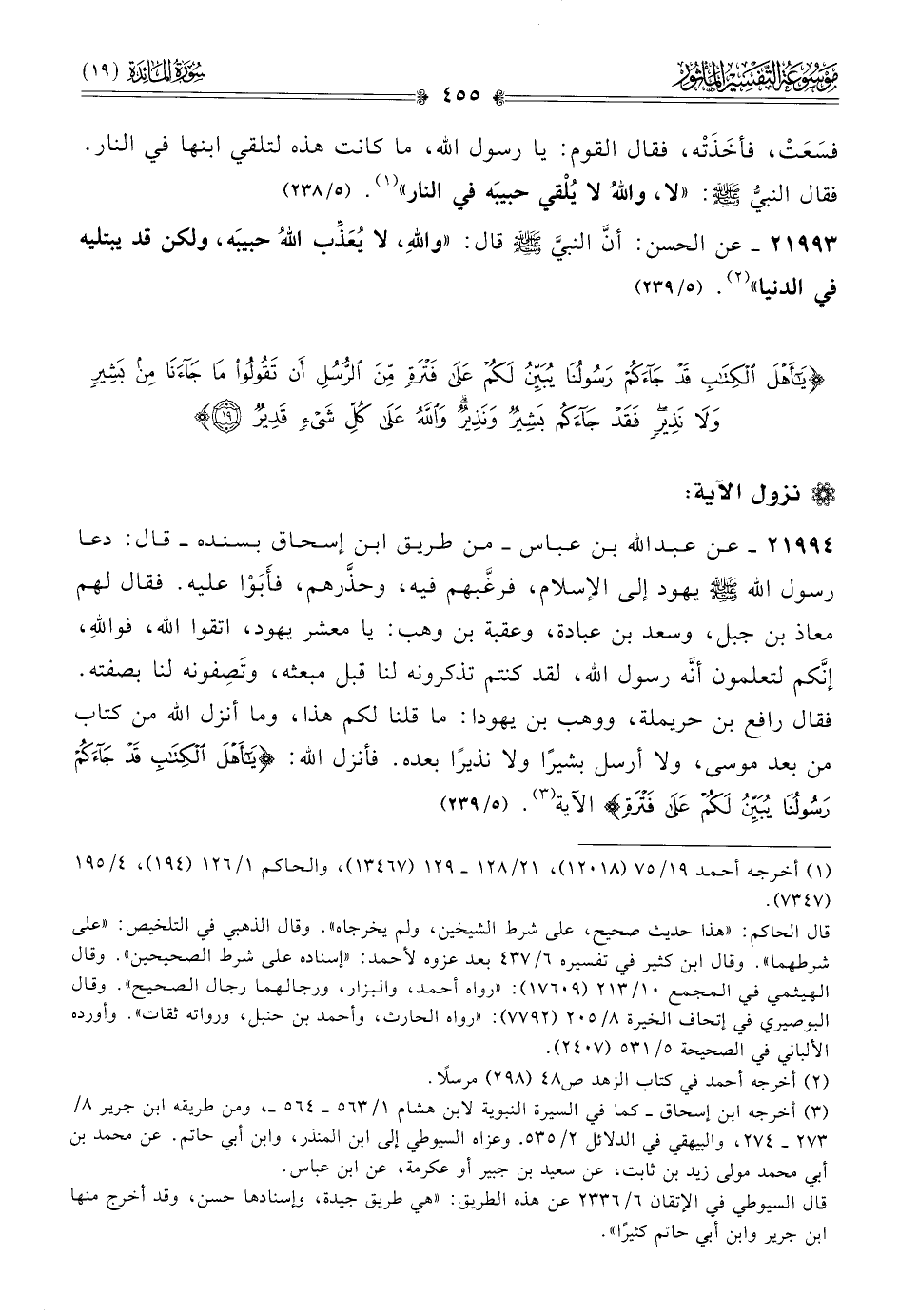 ٢١٩٩٤ - عن عبد الله بن عباس -من طريق ابن إسحاق بسنده- قال: دعا رسول الله - صلى الله عليه وسلم - يهود إلى الإسلام، فرغَّبهم فيه، وحذَّرهم، فأَبَوْا عليه. فقال لهم معاذ بن جبل، وسعد بن عبادة، وعقبة بن وهب: يا معشر يهود، اتقوا الله، فواللهِ، إنّكم لتعلمون أنّه رسول الله، لقد كنتم تذكرونه لنا قبل مبعثه، وتَصِفونه لنا بصفته. فقال رافع بن حريملة، ووهب بن يهودا: ما قلنا لكم هذا، وما أنزل الله من كتاب من بعد موسى، ولا أرسل بشيرًا ولا نذيرًا بعده. فأنزل الله: {يا أهل الكتاب قد جاءكم رسولنا يبين لكم على فترة} الآية (¬٣). (٥/ ٢٣٩)