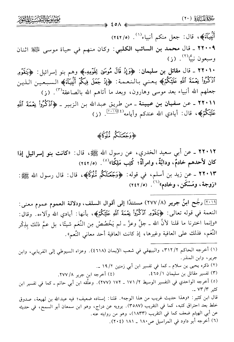٢٢٠١٣ - عن زيد بن أسلم، في قوله: {وجعلكم ملوكا}، قال: قال رسول الله - صلى الله عليه وسلم -: «زوجة، ومَسْكَن، وخادم» (¬٦). (٥/ ٢٤٢)