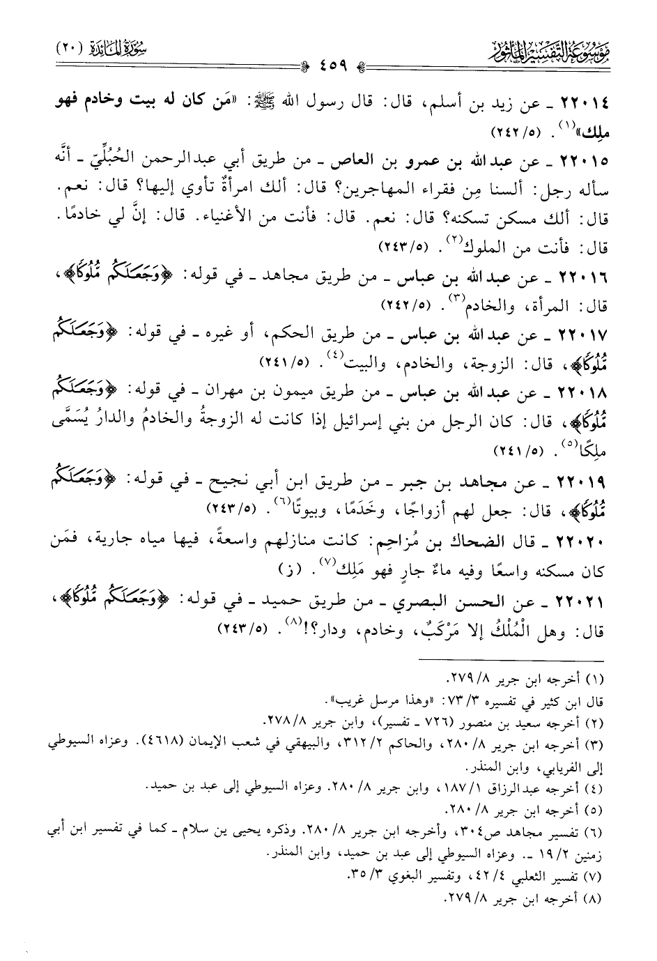 ٢٢٠١٧ - عن عبد الله بن عباس -من طريق الحكم، أو غيره- في قوله: {وجعلكم ملوكا}، قال: الزوجة، والخادم، والبيت (¬٤). (٥/ ٢٤١)