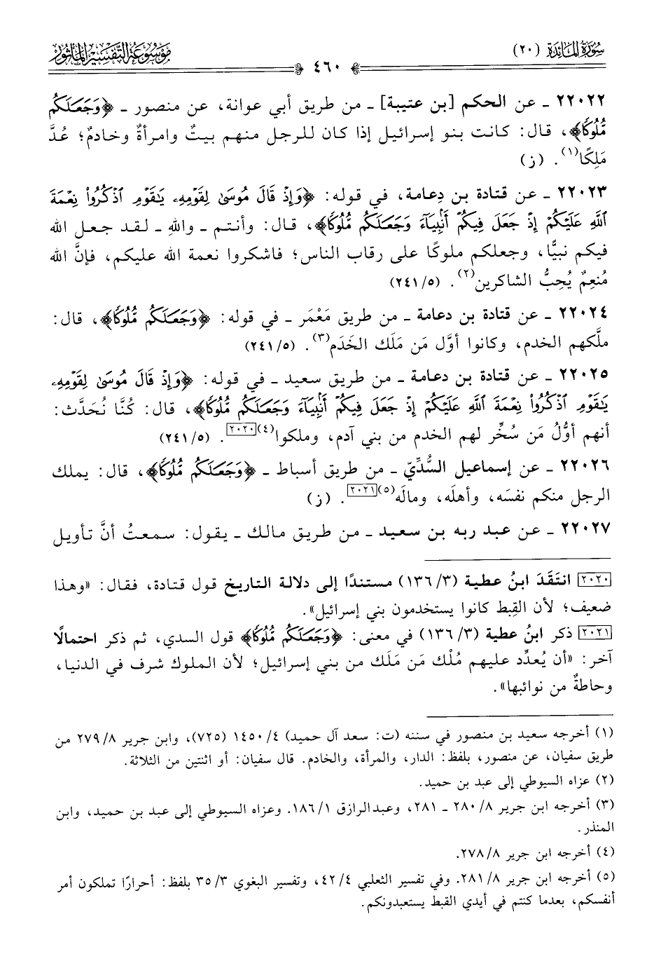 ٢٢٠٢٥ - عن قتادة بن دعامة -من طريق سعيد- في قوله: {وإذ قال موسى لقومه يا قوم اذكروا نعمة الله عليكم إذ جعل فيكم أنبياء وجعلكم ملوكا}، قال: كُنّا نُحَدَّث: أنهم أوُّلُ مَن سُخِّر لهم الخدم من بني آدم، وملكوا (¬٤) [٢٠٢٠]. (٥/ ٢٤١)