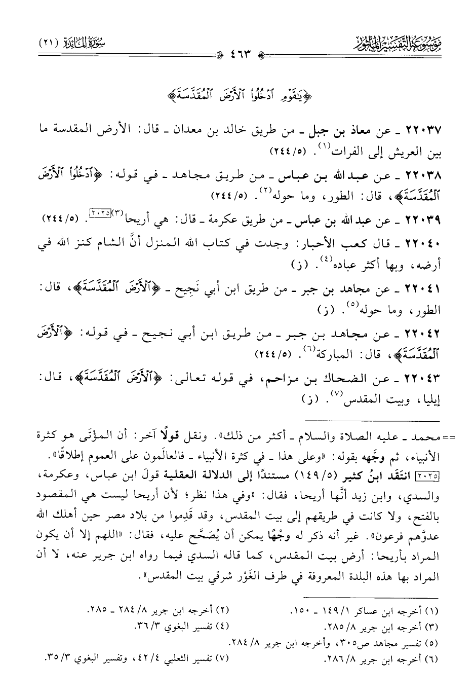 ٢٢٠٤٢ - عن مجاهد بن جبر -من طريق ابن أبي نجيح- في قوله: {الأرض المقدسة}، قال: المباركة (¬٦). (٥/ ٢٤٤)