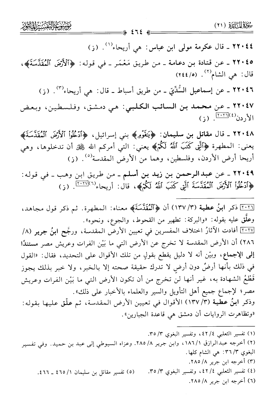 [٢٠٢٧] أفادت الآثارُ اختلاف المفسرين في تعيين الأرض المقدسة، ورجَّح ابنُ جرير (٨/ ٢٨٦) أن الأرض المقدسة لا تخرج عن الأرض التي ما بَيْن الفرات وعريش مصر مستندًا إلى الإجماع، وبيّن أنه لا دليل يقطع بقولٍ من تلك الأقوال على التحديد، فقال: «القول في ذلك بأنها أرضٌ دون أرضٍ لا تدرك حقيقة صحته إلا بالخبر، ولا خبر بذلك يجوز قَطْعُ الشهادة به، غير أنها لن تخرج من أن تكون الأرض التي ما بَيْن الفرات وعريش مصر؛ لإجماع جميع أهل التأويل والسير والعلماء بالأخبار على ذلك».