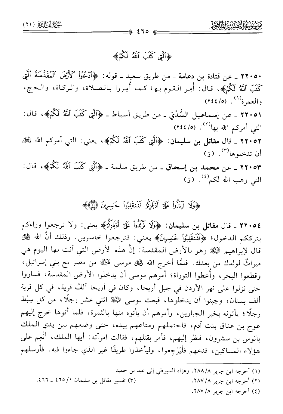٢٢٠٥٢ - قال مقاتل بن سليمان: {الَّتِي كَتَبَ اللَّهُ لَكُمْ}، يعني: التي أمركم الله - عز وجل - أن تدخلوها (¬٣). (ز)