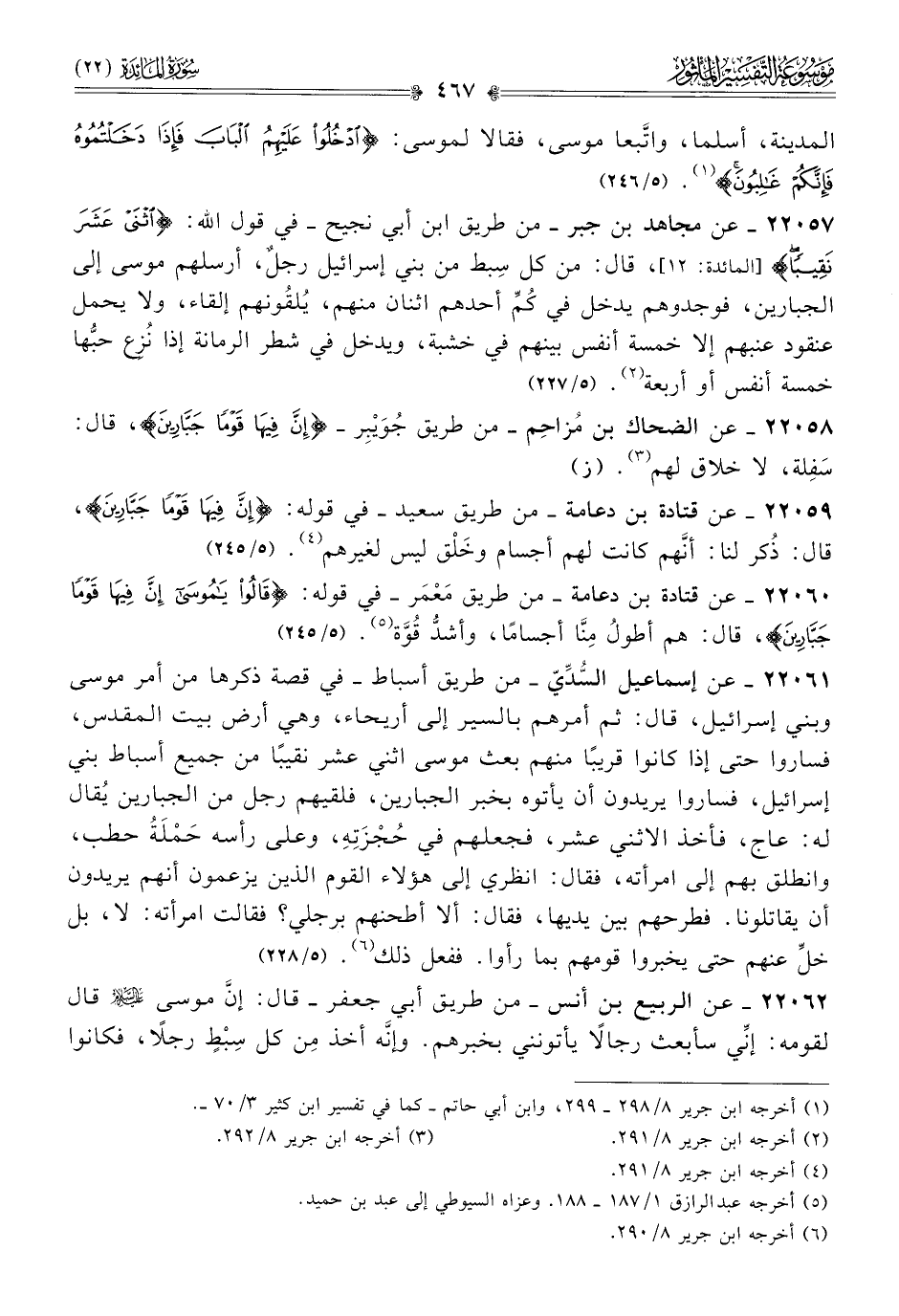 ٢٢٠٦١ - عن إسماعيل السُّدِّيّ -من طريق أسباط- في قصة ذكرها من أمر موسى وبني إسرائيل، قال: ثم أمرهم بالسير إلى أريحاء، وهي أرض بيت المقدس، فساروا حتى إذا كانوا قريبًا منهم بعث موسى اثني عشر نقيبًا من جميع أسباط بني إسرائيل، فساروا يريدون أن يأتوه بخبر الجبارين، فلقيهم رجل من الجبارين يُقال له: عاج، فأخذ الاثني عشر، فجعلهم في حُجْزَتِهِ، وعلى رأسه حَمْلَةُ حطب، وانطلق بهم إلى امرأته، فقال: انظري إلى هؤلاء القوم الذين يزعمون أنهم يريدون أن يقاتلونا. فطرحهم بين يديها، فقال: ألا أطحنهم برجلي؟ فقالت امرأته: لا، بل خلِّ عنهم حتى يخبروا قومهم بما رأوا. ففعل ذلك (¬٦). (٥/ ٢٢٢٨)
