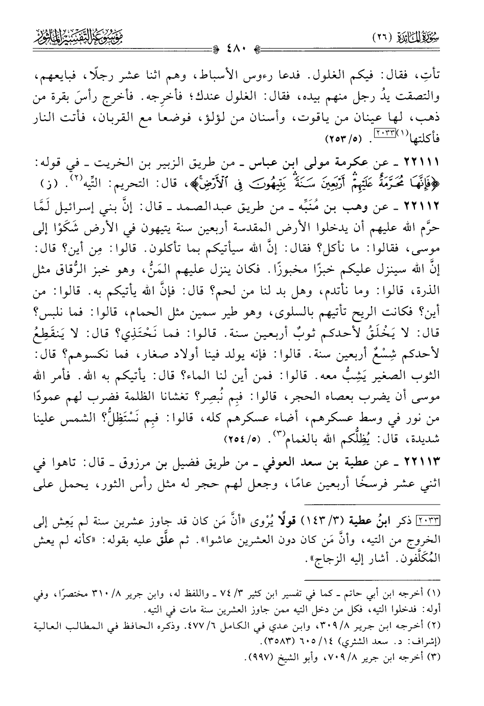 ٢٢١١٣ - عن عطية بن سعد العوفي -من طريق فضيل بن مرزوق- قال: تاهوا في اثني عشر فرسخًا أربعين عامًا، وجعل لهم حجر له مثل رأس الثور، يحمل على