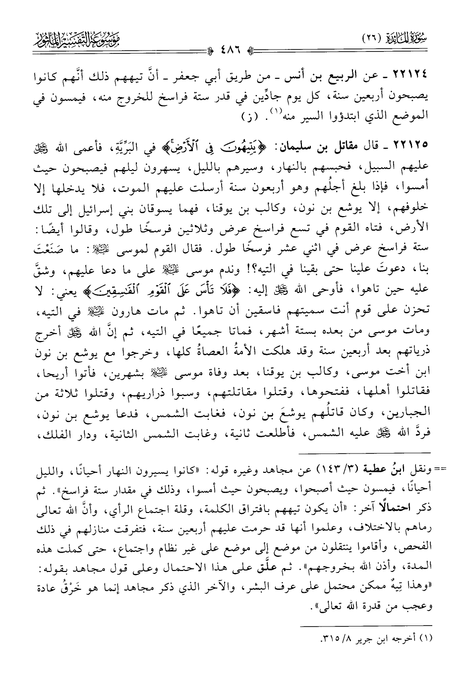 ٢٢١٢٥ - قال مقاتل بن سليمان: {يَتِيهُونَ فِي الأَرْضِ} في البَرِّيَّةِ، فأعمى الله - عز وجل - عليهم السبيل، فحبسهم بالنهار، وسيرهم بالليل، يسهرون ليلهم فيصبحون حيث أمسوا، فإذا بلغ أجلُهم وهو أربعون سنة أرسلت عليهم الموت، فلا يدخلها إلا خلوفهم، إلا يوشع بن نون، وكالب بن يوقنا، فهما يسوقان بني إسرائيل إلى تلك الأرض، فتاه القوم في تسع فراسخ عرض وثلاثين فرسخًا طول، وقالوا أيضًا: ستة فراسخ عرض في اثني عشر فرسخًا طول. فقال القوم لموسى - عليه السلام -: ما صَنَعْتَ بنا، دعوتَ علينا حتى بقينا في التيه؟! وندم موسى - عليه السلام - على ما دعا عليهم، وشقَّ عليه حين تاهوا، فأوحى الله - عز وجل - إليه: {فَلا تَأْسَ عَلى القَوْمِ الفاسِقِينَ} يعني: لا تحزن على قوم أنت سميتهم فاسقين أن تاهوا. ثم مات هارون - عليه السلام - في التيه، ومات موسى من بعده بستة أشهر، فماتا جميعًا في التيه، ثم إنّ الله - عز وجل - أخرج ذرياتهم بعد أربعين سنة وقد هلكت الأمةُ العصاةُ كلها، وخرجوا مع يوشع بن نون ابن أخت موسى، وكالب بن يوقنا، بعد وفاة موسى - عليه السلام - بشهرين، فأتوا أريحا، فقاتلوا أهلها، ففتحوها، وقتلوا مقاتلتهم، وسبوا ذراريهم، وقتلوا ثلاثة من الجبارين، وكان قاتلُهم يوشعَ بن نون، فغابت الشمس، فدعا يوشع بن نون، فردَّ الله - عز وجل - عليه الشمس، فأطلعت ثانية، وغابت الشمس الثانية، ودار الفلك،