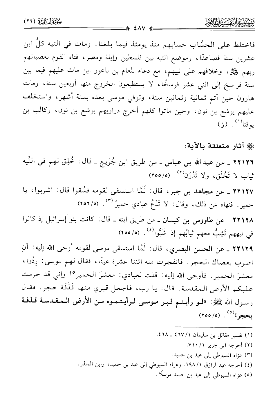 ٢٢١٢٦ - عن عبد الله بن عباس -من طريق ابن جُرَيج- قال: خُلِق لهم في التِّيه ثياب لا تَخْلَق، ولا تَدْرَن (¬٢). (٥/ ٢٥٥)