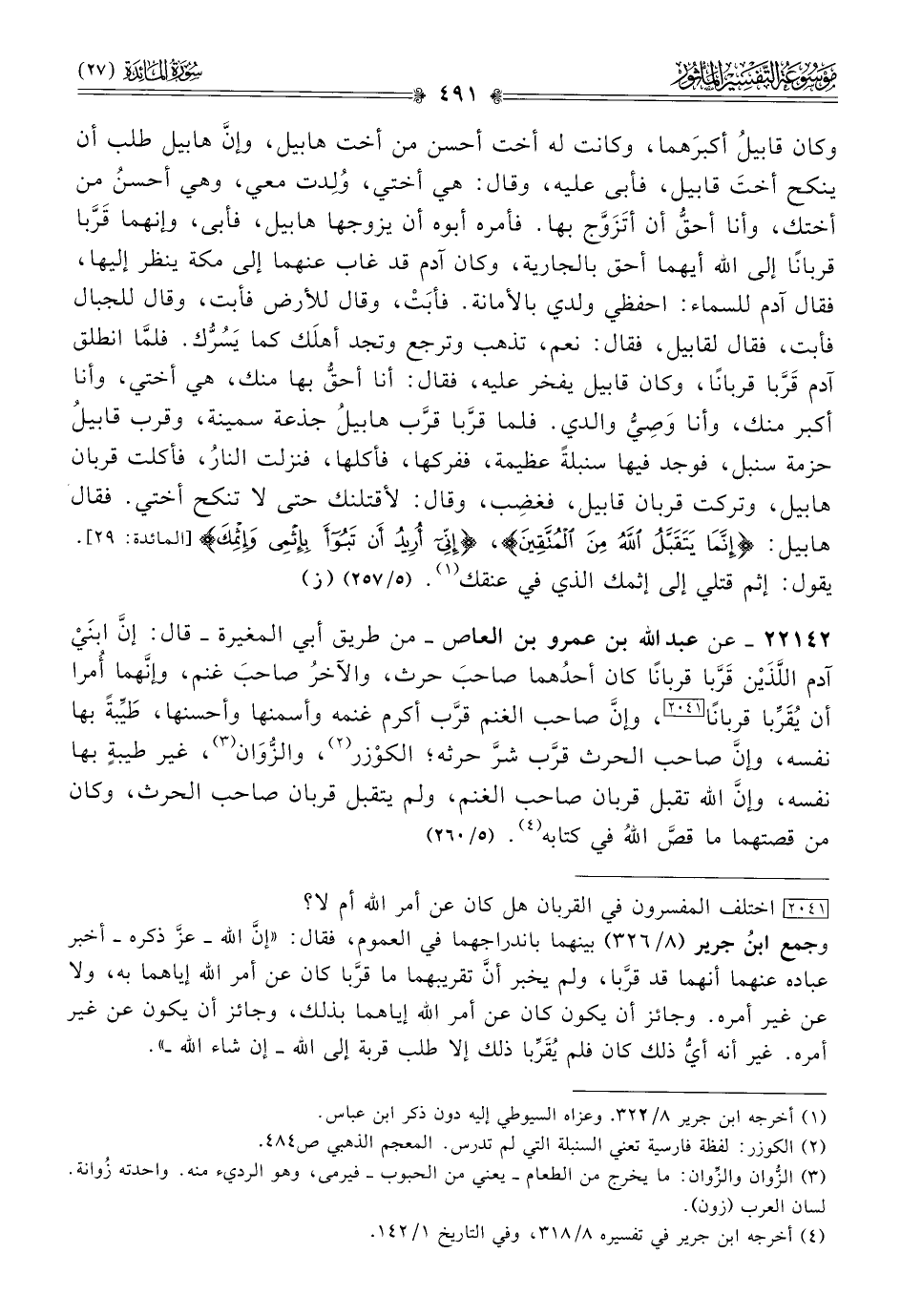 ٢٢١٤٢ - عن عبد الله بن عمرو بن العاص -من طريق أبي المغيرة- قال: إنّ ابنَيْ آدم اللَّذَيْن قَرَّبا قربانًا كان أحدُهما صاحبَ حرث، والآخرُ صاحبَ غنم، وإنّهما أُمرا أن يُقَرِّبا قربانًا [٢٠٤١]، وإنّ صاحب الغنم قرَّب أكرم غنمه وأسمنها وأحسنها، طَيِّبةً بها نفسه، وإنّ صاحب الحرث قرَّب شرَّ حرثه؛ الكوْزر (¬٢)، والزُّوان (¬٣)، غير طيبةٍ بها نفسه، وإنّ الله تقبل قربان صاحب الغنم، ولم يتقبل قربان صاحب الحرث، وكان من قصتهما ما قصَّ اللهُ في كتابه (¬٤). (٥/ ٢٦٠)