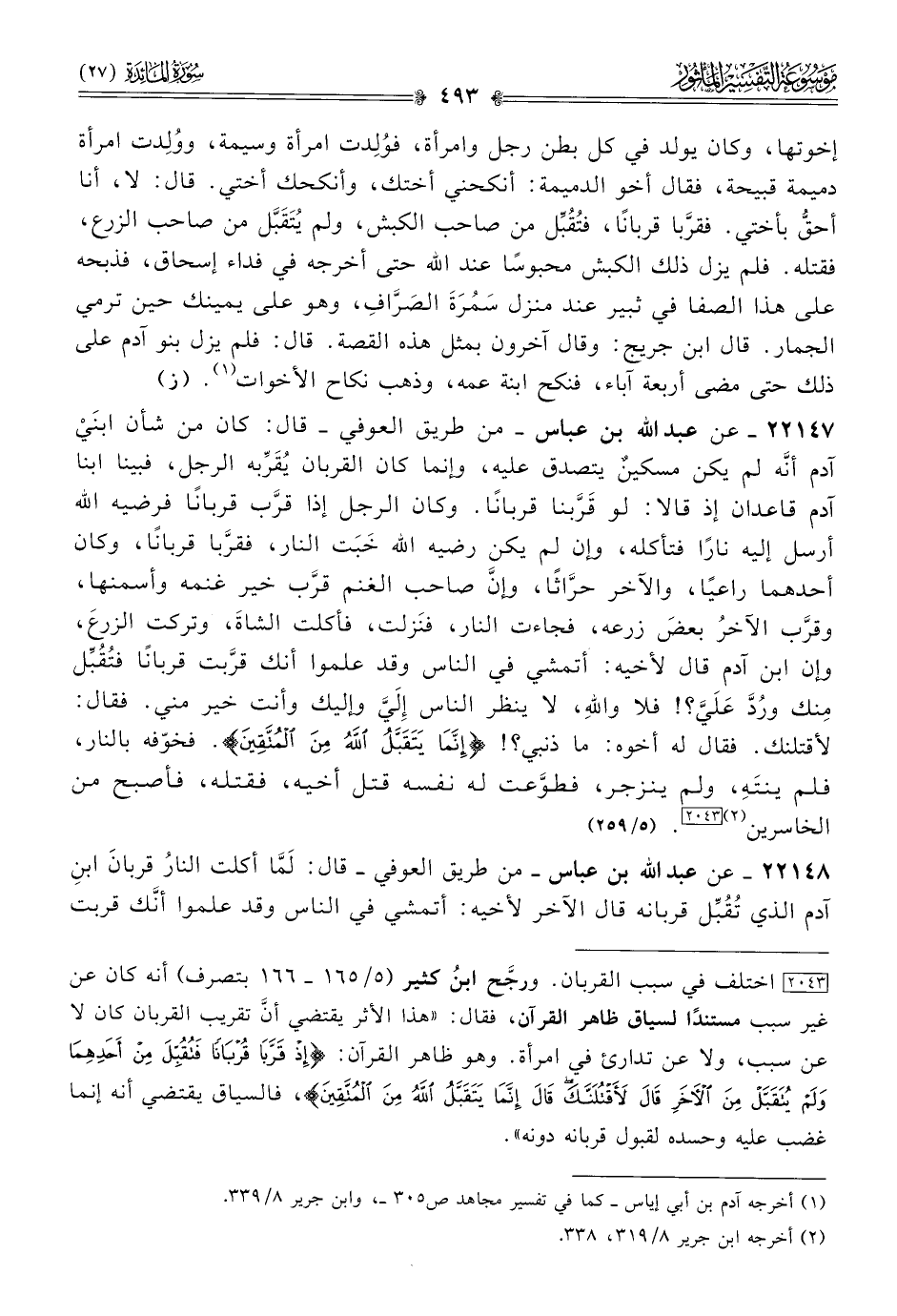 ٢٢١٤٨ - عن عبد الله بن عباس -من طريق العوفي- قال: لَمّا أكلت النارُ قربانَ ابنِ آدم الذي تُقُبِّل قربانه قال الآخر لأخيه: أتمشي في الناس وقد علموا أنّك قربت
