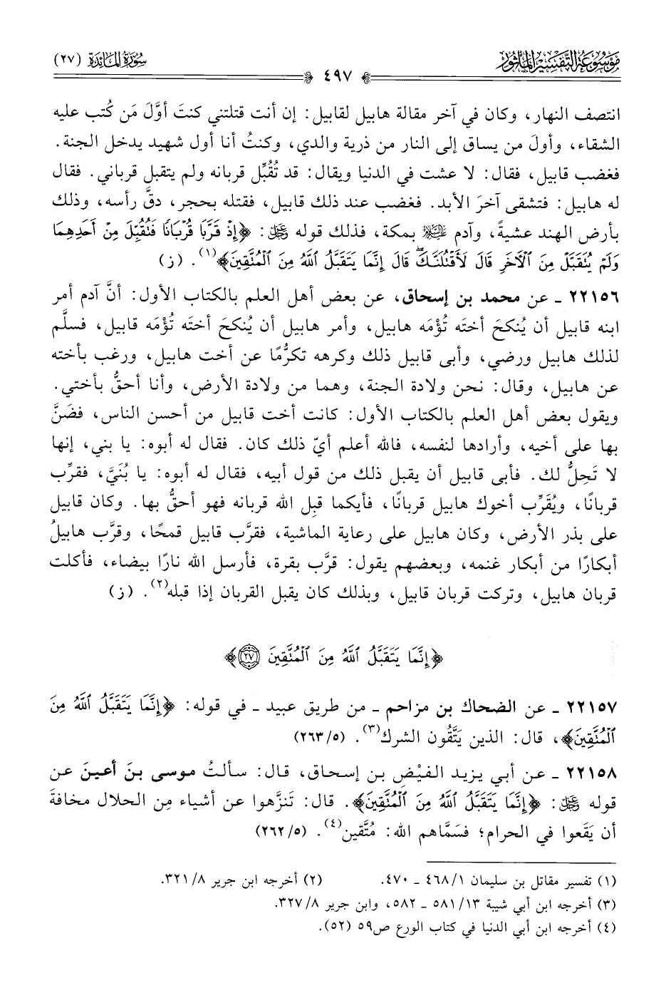 ٢٢١٥٧ - عن الضحاك بن مزاحم -من طريق عبيد- في قوله: {إنما يتقبل الله من المتقين}، قال: الذين يَتَّقُون الشرك (¬٣). (٥/ ٢٦٣)