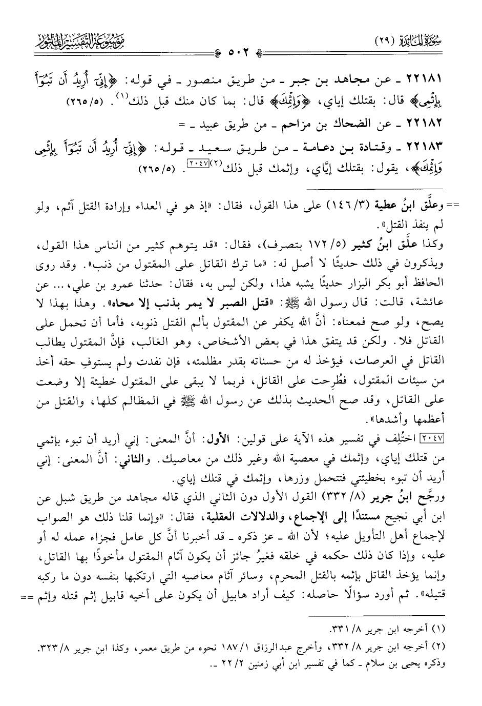 ٢٢١٨١ - عن مجاهد بن جبر -من طريق منصور- في قوله: {إني أريد أن تبوء بإثمي} قال: بقتلك إياي، {وإثمك} قال: بما كان منك قبل ذلك (¬١). (٥/ ٢٦٥)