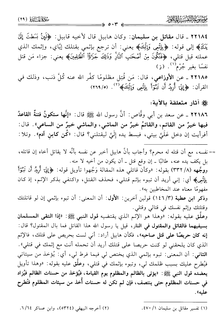 ٢٢١٨٤ - قال مقاتل بن سليمان: وكان هابيل قال لأخيه قابيل: {لَئِنْ بَسَطْتَ إلَيَّ يَدَكَ} إلى قوله: {بِإثْمِي وإثْمِكَ} يعني: أن ترجع بإثمي بقتلك إيّاي، وإثمك الذي عملته قبل قتلي، {فَتَكُونَ مِن أصْحابِ النّارِ وذَلِكَ جَزاءُ الظّالِمِينَ} يعني: جزاء مَن قتل نفسًا بغير جُرْم (¬١). (ز)