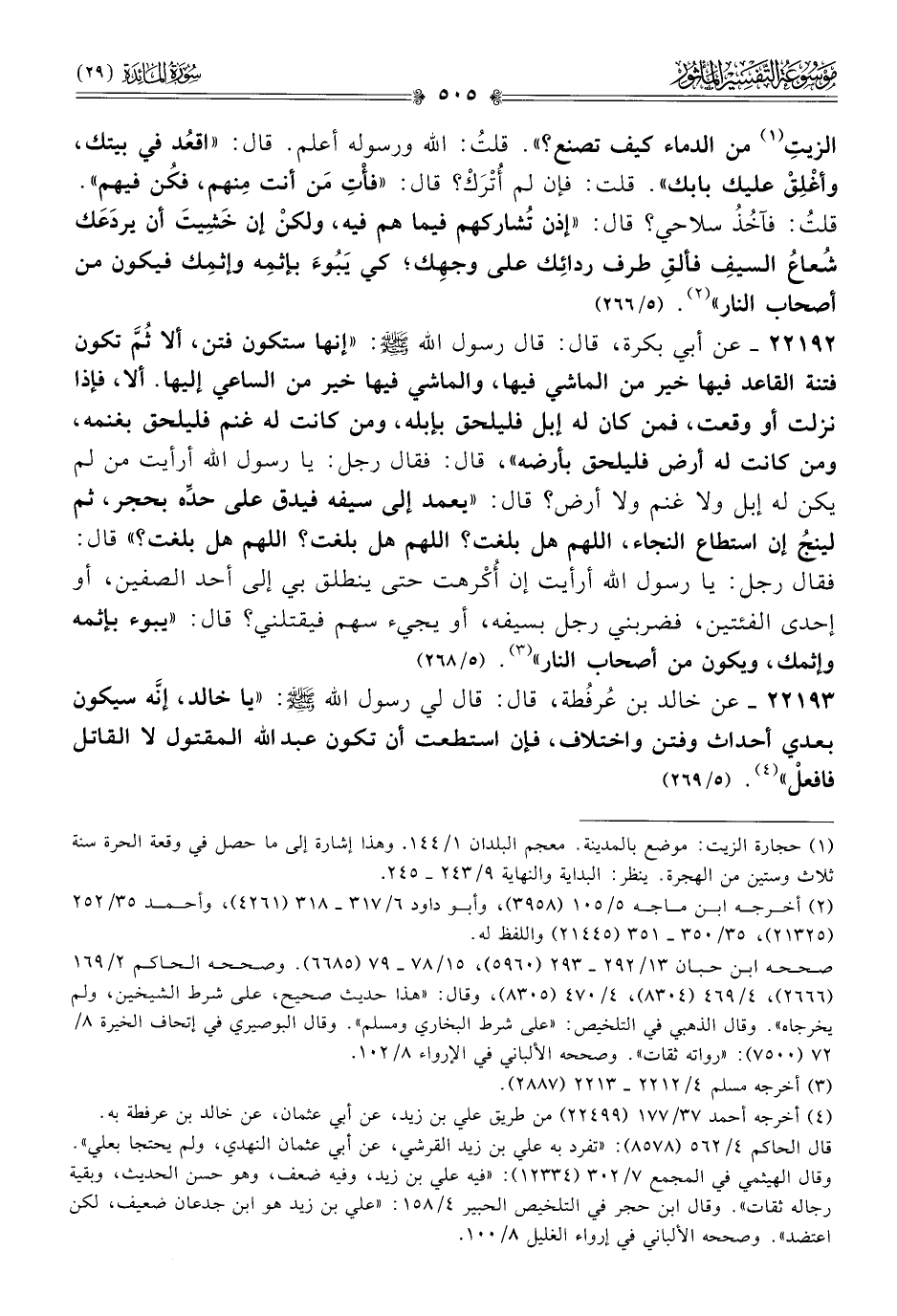 الزيتِ (¬١) من الدماء كيف تصنع؟». قلتُ: الله ورسوله أعلم. قال: «اقعُد في بيتك، وأغْلِقْ عليك بابك». قلت: فإن لم أُتْرَكْ؟ قال: «فأْتِ مَن أنت مِنهم، فكُن فيهم». قلتُ: فآخُذُ سلاحي؟ قال: «إذن تُشاركهم فيما هم فيه، ولكنْ إن خَشِيتَ أن يردَعَك شُعاعُ السيفِ فألقِ طرف ردائِك على وجهِك؛ كي يَبُوءَ بإثمِه وإثمِك فيكون من أصحاب النار» (¬٢). (٥/ ٢٦٦)