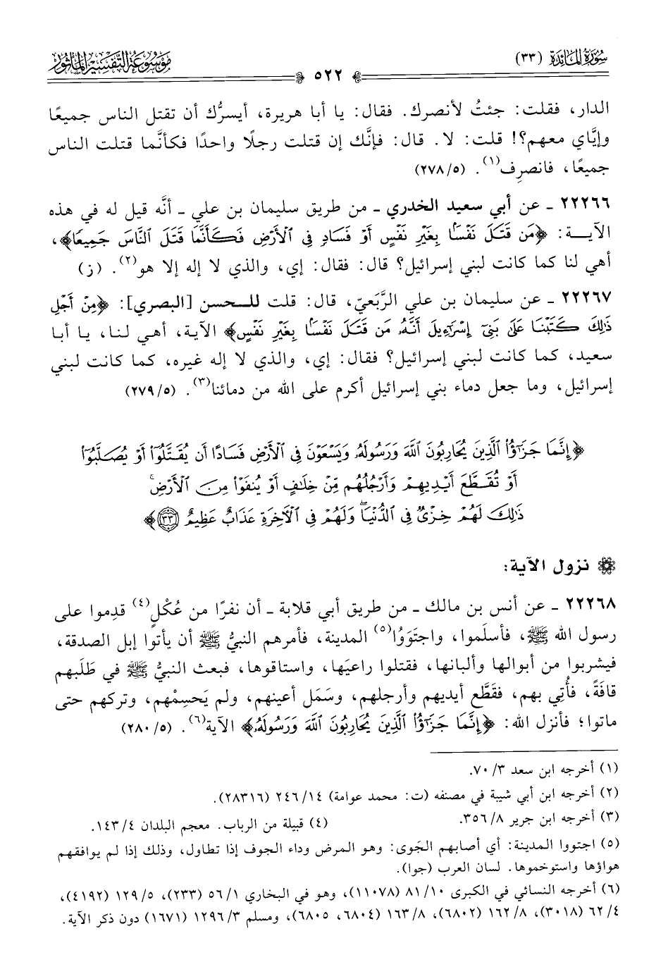 ٢٢٢٦٨ - عن أنس بن مالك -من طريق أبي قلابة-: أن نفرًا من عُكْلٍ (¬٤) قدِموا على رسول الله - صلى الله عليه وسلم -، فأسلَموا، واجتَوَوُا (¬٥) المدينة، فأمرهم النبي - صلى الله عليه وسلم - أن يأتوا إبل الصدقة، فيشربوا من أبوالها وألبانها، فقتلوا راعيَها، واستاقوها، فبعث النبي - صلى الله عليه وسلم - في طَلَبهم قافَةً، فأُتِي بهم، فقَطَّع أيديهم وأرجلهم، وسَمَل أعينهم، ولم يَحسِمْهم، وتركهم حتى ماتوا؛ فأنزل الله: {إنما جزاء الذين يحاربون الله ورسوله} الآية (¬٦). (٥/ ٢٨٠)