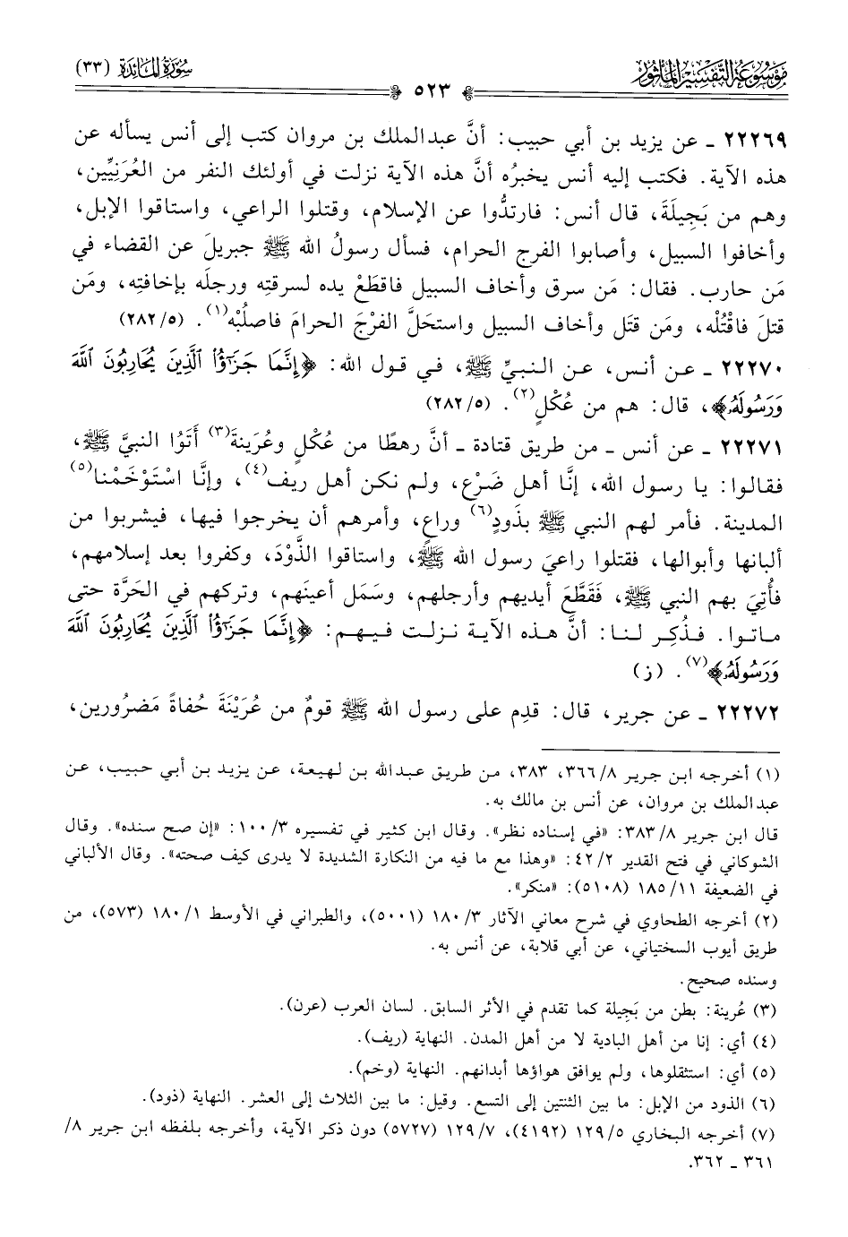 ٢٢٢٧٠ - عن أنس، عن النبي - صلى الله عليه وسلم -، في قول الله: {إنما جزاء الذين يحاربون الله ورسوله}، قال: هم من عُكْلٍ (¬٢). (٥/ ٢٨٢)