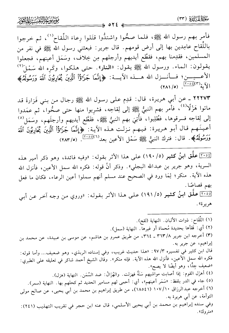 [٢٠٥٤] علَّق ابنُ كثير (٥/ ١٩٠) على هذا الأثر بقوله: «وفيه فائدة، وهو ذكر أمير هذه السرية، وهو جرير بن عبد الله البجلي». وذكر أنّ قوله: فكره الله سمل الأعين، فأنزل الله هذه الآية. منكر؛ لِما ورد في الصحيح عند مسلم أنهم سملوا أعين الرعاء، فكان ما فعل بهم قصاصًا.