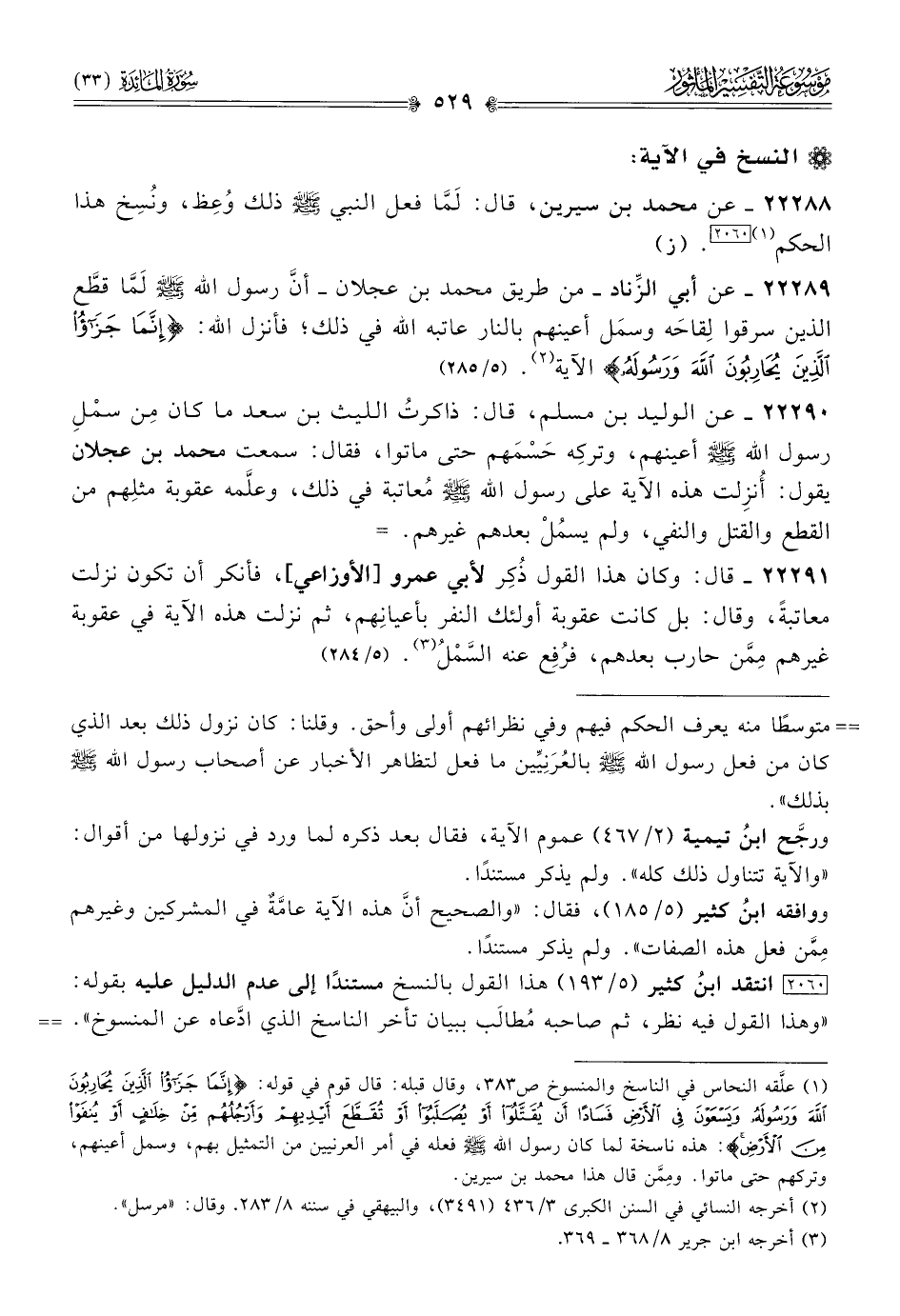 [٢٠٦٠] انتقد ابنُ كثير (٥/ ١٩٣) هذا القول بالنسخ مستندًا إلى عدم الدليل عليه بقوله: «وهذا القول فيه نظر، ثم صاحبه مُطالَب ببيان تأخر الناسخ الذي ادَّعاه عن المنسوخ». وذكر أنّ هناك مَن قالوا بأنّ هذا كان قبل الحدود، ونسبه لابن سيرين. ثم علَّق (٥/ ١٩٣) عليه بقوله: «وفي هذا نظر؛ فإنّ قصتهم متأخرة، وفي رواية جرير بن عبد الله [الواردة في نزول الآية] لقصتهم ما يدل على تأخرها؛ فإنه أسلم بعد نزول المائدة».وذكر ابنُ عطية (٣/ ١٥٤) قولًا بأن هذه الآية ليست بناسخة لذلك الفعل؛ لأن ذلك وقع في المرتدين، وأنها في المحارب المؤمن. وعلَّق عليه بقوله: «لا سيما وفي بعض الطرق أنهم سملوا أعين الرعاة».