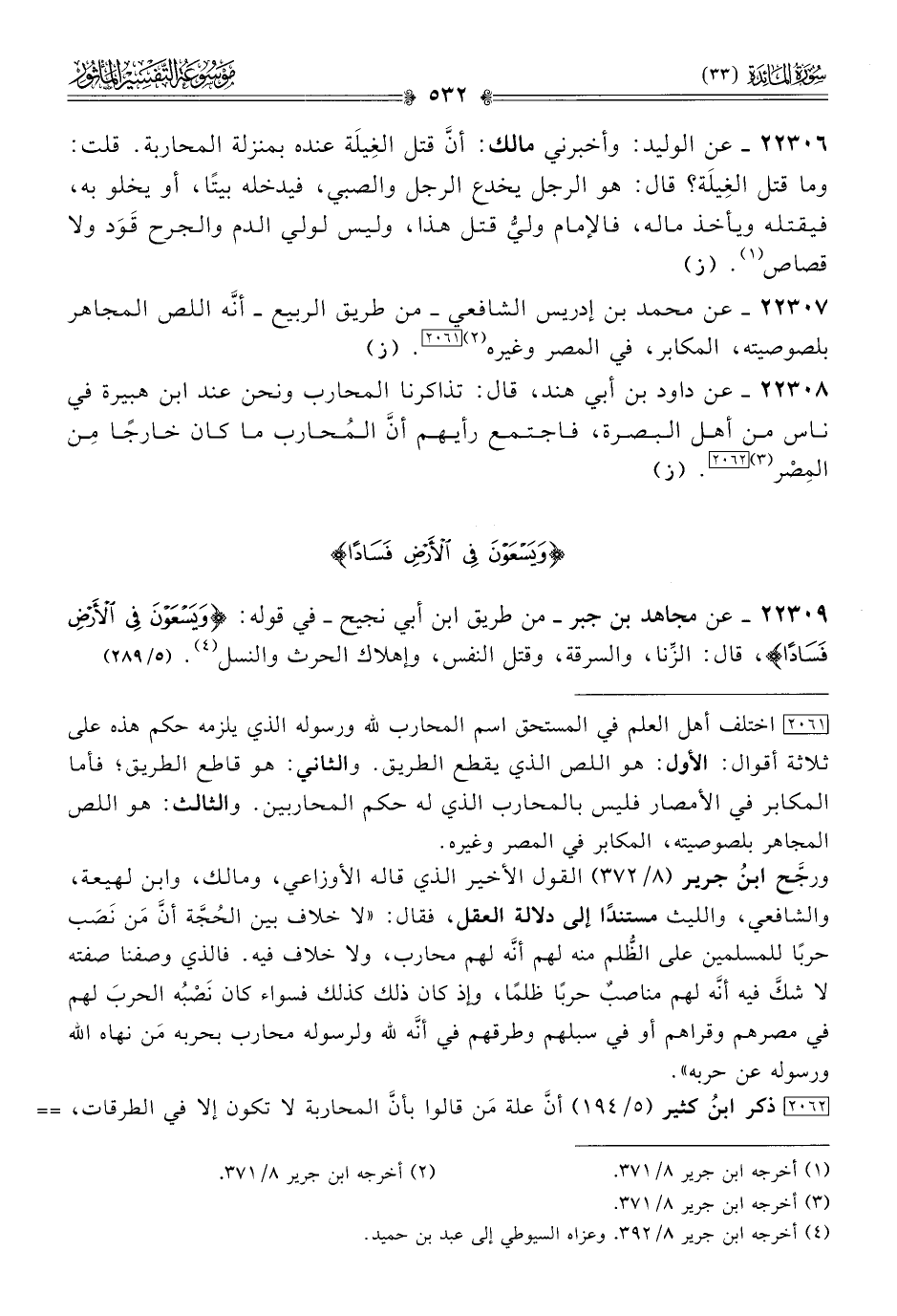 ٢٢٣٠٩ - عن مجاهد بن جبر -من طريق ابن أبي نجيح- في قوله: {ويسعون في الأرض فسادا}، قال: الزِّنا، والسرقة، وقتل النفس، وإهلاك الحرث والنسل (¬٤). (٥/ ٢٨٩)