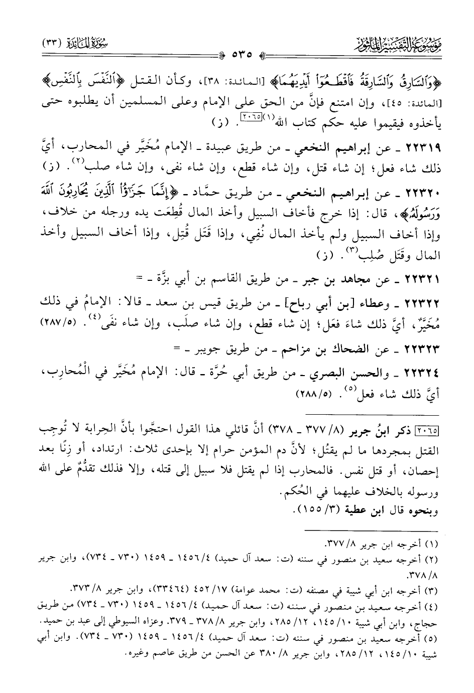 ٢٢٣٢٠ - عن إبراهيم النخعي -من طريق حمّاد- {إنما جزاء الذين يحاربون الله ورسوله}، قال: إذا خرج فأخاف السبيل وأخذ المال قُطِعَت يده ورجله من خلاف، وإذا أخاف السبيل ولم يأخذ المال نُفِي، وإذا قَتَل قُتِل، وإذا أخاف السبيل وأخذ المال وقَتَل صُلِب (¬٣). (ز)