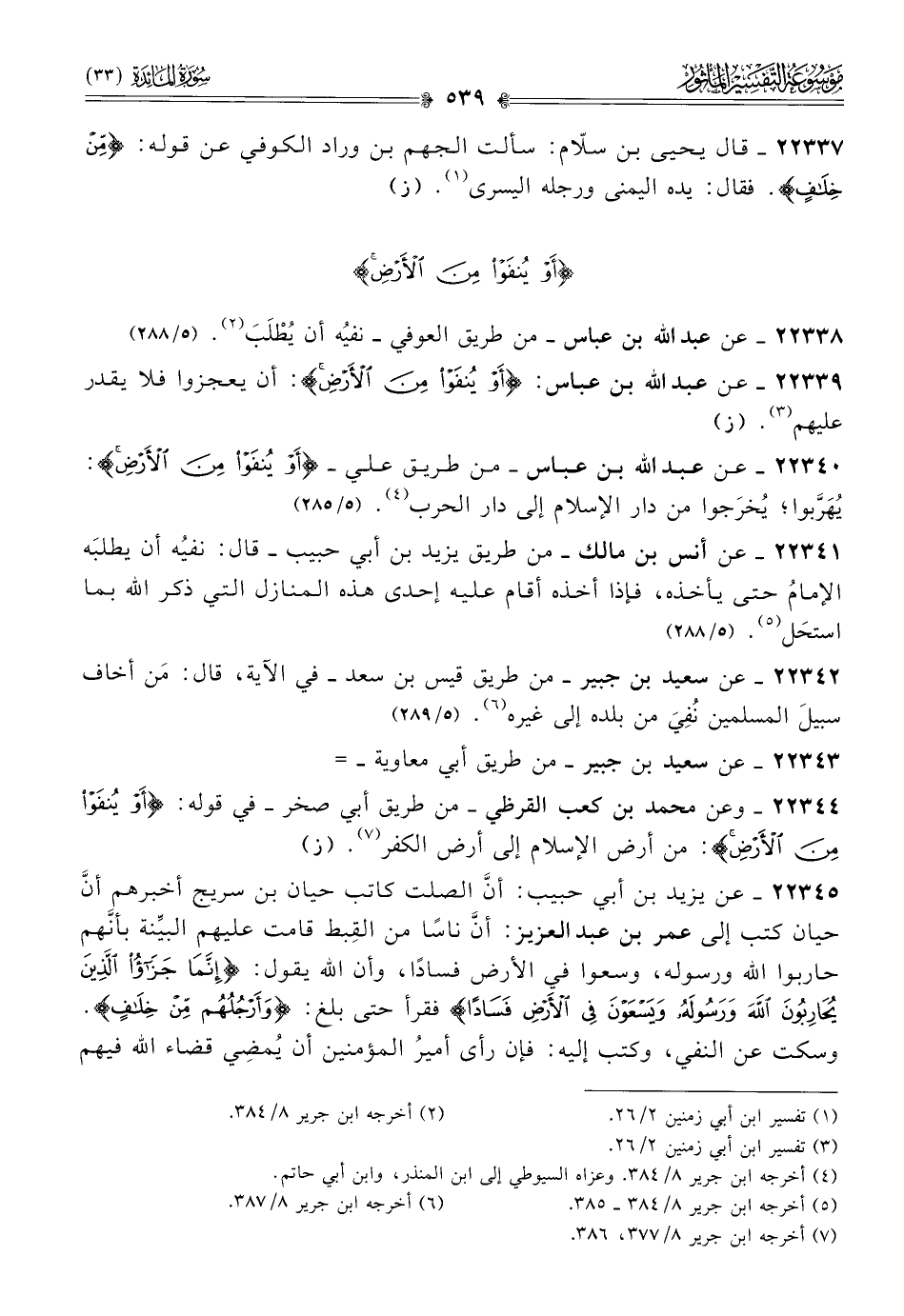٢٢٣٤٠ - عن عبد الله بن عباس -من طريق علي- {أو ينفوا من الأرض}: يُهَرَّبوا؛ يُخرَجوا من دار الإسلام إلى دار الحرب (¬٤). (٥/ ٢٨٥)