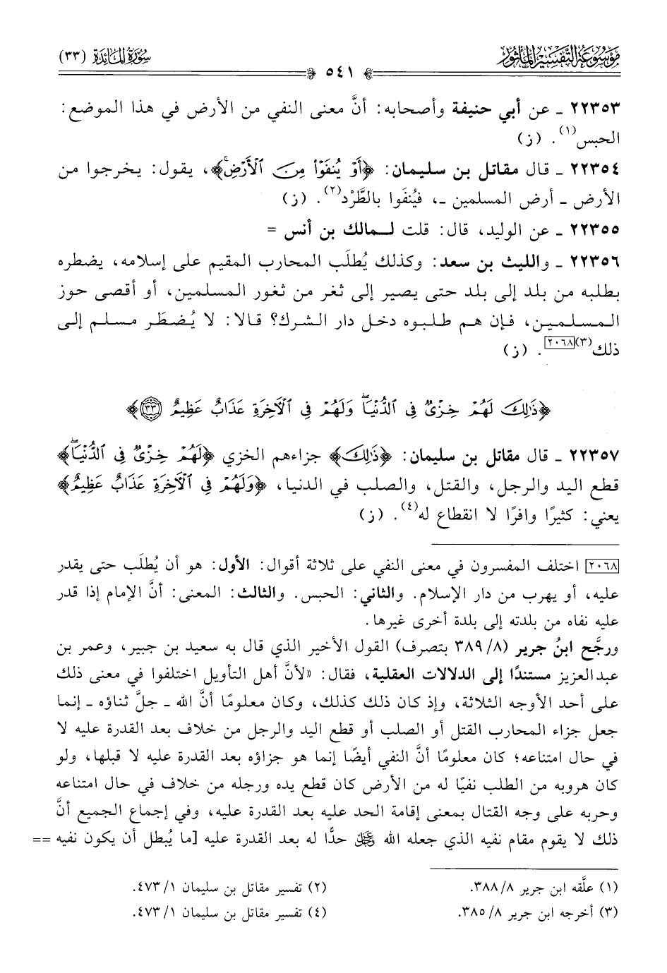 ورجَّح ابنُ جرير (٨/ ٣٨٩ بتصرف) القول الأخير الذي قال به سعيد بن جبير، وعمر بن عبد العزيز مستندًا إلى الدلالات العقلية، فقال: «لأنّ أهل التأويل اختلفوا في معنى ذلك على أحد الأوجه الثلاثة، وإذ كان ذلك كذلك، وكان معلومًا أنّ الله -جلَّ ثناؤه- إنما جعل جزاء المحارب القتل أو الصلب أو قطع اليد والرجل من خلاف بعد القدرة عليه لا في حال امتناعه؛ كان معلومًا أنّ النفي أيضًا إنما هو جزاؤه بعد القدرة عليه لا قبلها، ولو كان هروبه من الطلب نفيًا له من الأرض كان قطع يده ورجله من خلاف في حال امتناعه وحربه على وجه القتال بمعنى إقامة الحد عليه بعد القدرة عليه، وفي إجماع الجميع أنّ ذلك لا يقوم مقام نفيه الذي جعله الله - عز وجل - حدًّا له بعد القدرة عليه [ما يُبطل أن يكون نفيه من الأرض: هروبه من الطلب]، وإذ كان كذلك فمعلومٌ أنّه لم يبق إلا الوجهان الآخران، وهو النفي من بلدة إلى أخرى غيرها، أو السجن. فإذ كان كذلك فلا شك أنّه إذا نُفِي من بلدة إلى أخرى غيرها فلم يُنفَ من الأرض، بل إنما نفي من أرض دون أرض، وإذ كان ذلك كذلك، وكان الله -جل ثناؤه- إنما أمر بنفيه من الأرض؛ كان معلومًا أنّه لا سبيل إلى نفيه من الأرض إلا بحبسه في بقعة منها عن سائرها، فيكون منفيًّا حينئذ عن جميعها، إلا مما لا سبيل إلى نفيه منه».