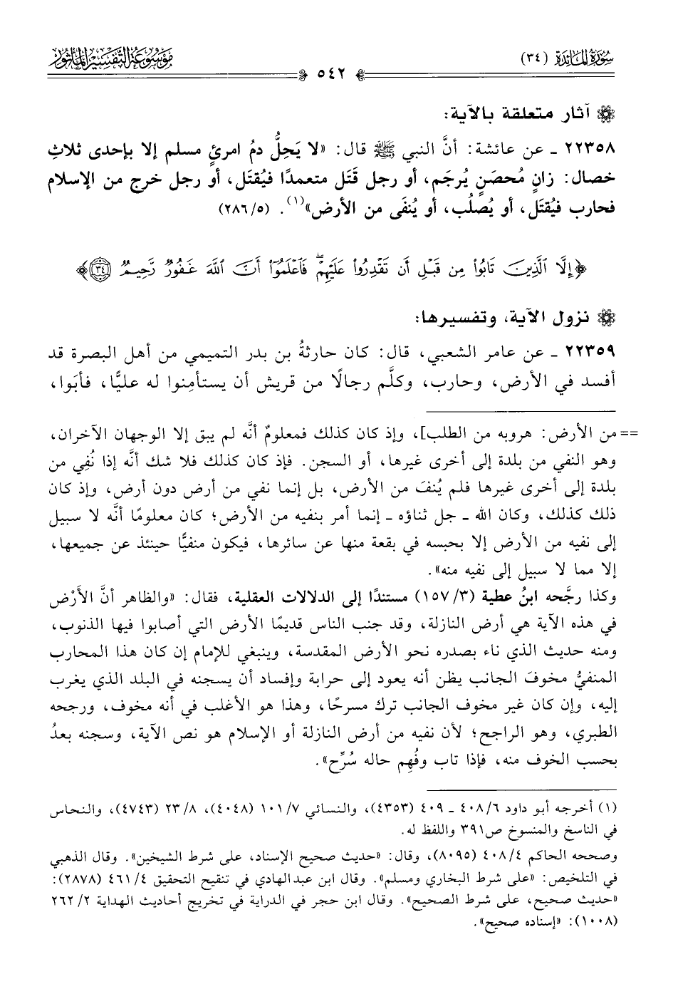 ٢٢٣٥٨ - عن عائشة، أنّ النبي - صلى الله عليه وسلم - قال: «لا يَحِلُّ دمُ امرئٍ مسلم إلا بإحدى ثلاثِ خصال: زانٍ مُحصَنٍ يُرجَم، أو رجل قَتَل متعمدًا فيُقتَل، أو رجل خرج من الإسلام فحارب فيُقتَل، أو يُصلُب، أو يُنفى من الأرض» (¬١).