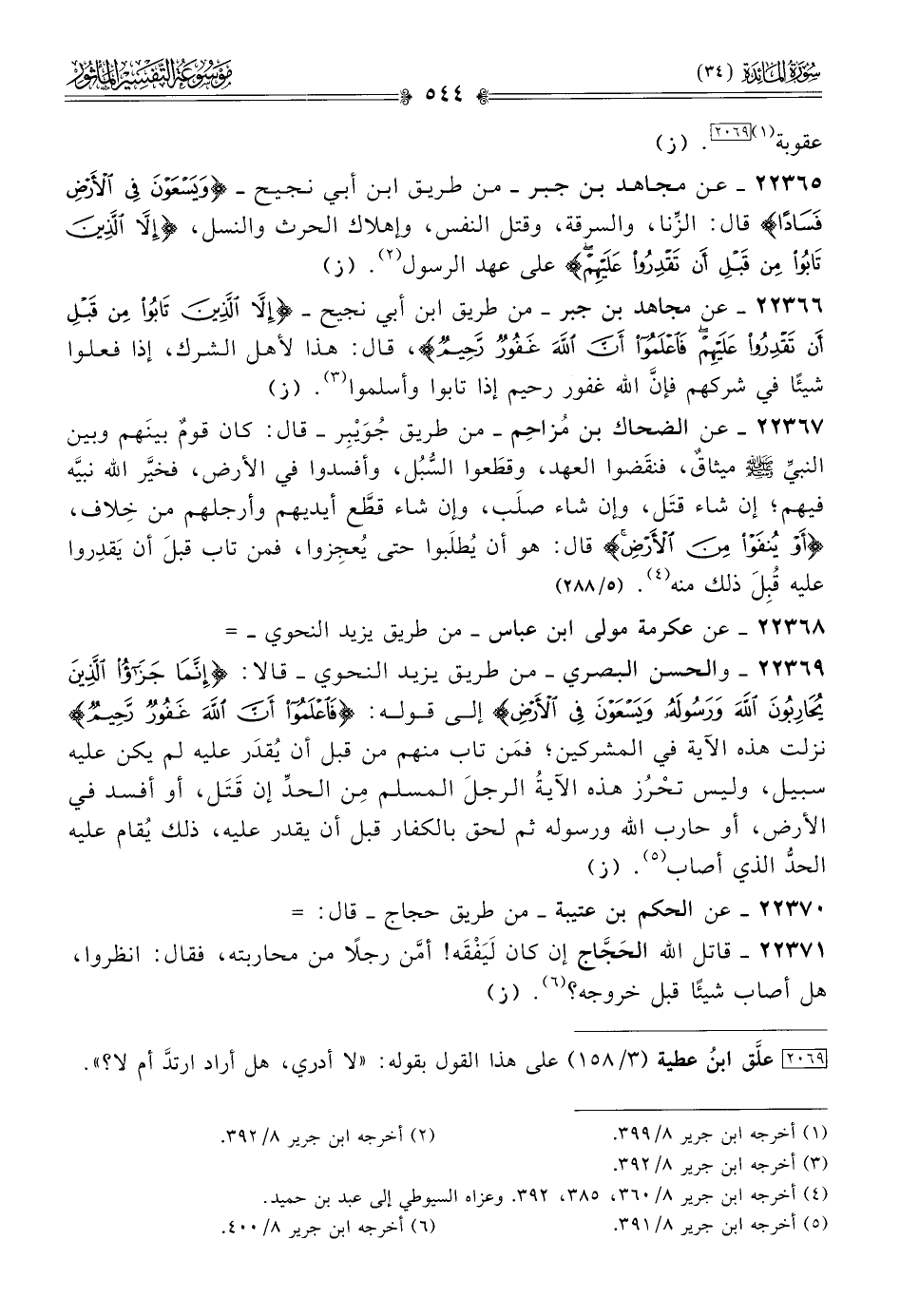 ٢٢٣٦٩ - والحسن البصري -من طريق يزيد النحوي- قالا: {إنَّما جَزاءُ الَّذِينَ يُحارِبُونَ اللَّهَ ورسولهُ ويَسْعَوْنَ فِي الأَرْضِ} إلى قوله: {فاعْلَمُوا أنَّ اللَّهَ غَفُورٌ رَحِيمٌ} نزلت هذه الآية في المشركين؛ فمَن تاب منهم من قبل أن يُقدَر عليه لم يكن عليه سبيل، وليس تحْرُز هذه الآيةُ الرجلَ المسلم مِن الحدِّ إن قَتَل، أو أفسد في الأرض، أو حارب الله ورسوله ثم لحق بالكفار قبل أن يقدر عليه، ذلك يُقام عليه الحدُّ الذي أصاب (¬٥). (ز)
